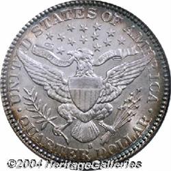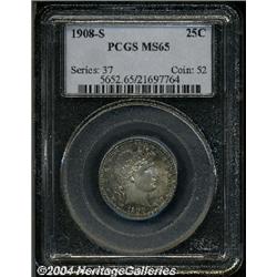 <B>1908-S<25C> MS65 PCGS.</B></I> The peripheral areas on each side are awash in sea-green and russet iridescence with the reverse being much lighter. Neither the striking pressure nor the surfaces preservation are worthy of criticism. One of only 784,000 pieces produced and highly desirable as such. Population: 7 in 65, 5 finer (9/04). <BR><BR><B>Important notice:</B> Heritage usually auctions material at the rate of 200-250 lots per hour. On some occasions eBay Live bid software or the Internet may not be able to keep up with the pace of the auction. We recommend placing a realistic absentee bid now as insurance to avoid disappointment. Occasionally the auctioneer may eliminate or reject an eBay Live bid, and the auctioneer may also reopen a lot after the close of the eBay live bidding (usually because we missed an audience bid), and may reject your bid even if it shows you as the winning bidder. By bidding via eBay Live, you agree that Heritage may award the lot to another bidder at its sole discretion under the circumstances described above or any other reasonable circumstances. Since eBay bids are not shown to us until we open the lot on the floor, we treat those bids just like floor bids. In most cases the floor responds before the eBay bid is presented to us, due to Internet lag time, so for consistency we have made it a policy that floor bids are always considered first over tie eBay live bids. Also please note that all Heritage lots purchased through eBay Live carry a 20% Buyer's Premium. Please make sure you read the Terms and Conditions before you bid.