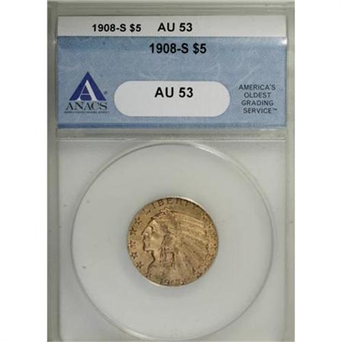 <B>1908-S $5 AU53 ANACS.</B></I> . NGC Census: (13/353). PCGS Population (4/312). Mintage: 82,000. Numismedia Wsl. Price for NGC/PCGS coin in AU53: $442. (#8512)<BR><BR><B>Coin Engraver:</B> Bela Lyon Pratt<BR><BR><b>Shipping:</b> Coins & Currency (<a target="_blank" href="http://www.heritageauctions.com/common/shipping.php">view shipping information</a>)