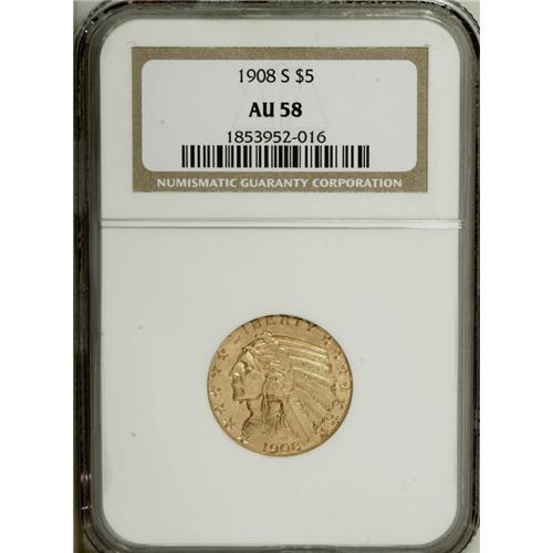 <B>1908-S $5 AU58 NGC.</B></I> This is a satiny near-Mint example that displays no obvious highpoint rub and only wispy blemishes that are noted mainly on the upper reverse. Boldly struck with pleasing khaki coloration and reddish-golden accents on the devices.<BR><I>From The Twin Hollows Collection, Part Two.</B></I><BR><BR><b>Shipping:</b> Coins & Currency (<a target="_blank" href="http://www.heritageauctions.com/common/shipping.php">view shipping information</a>)