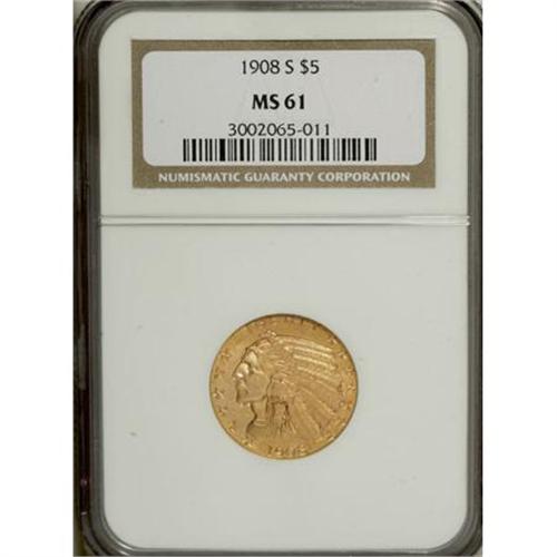 <B>1908-S $5 MS61 NGC.</B></I> Unlike most of the S-Mint Indian eagles, this date ranks among the most common issues of the series, despite a mintage of just 82,000 coins. This piece has subtle pink toning around lemon-yellow color with matte-like brilliant yellow luster<BR><BR><b>Shipping:</b> Coins & Currency (<a target="_blank" href="http://www.heritageauctions.com/common/shipping.php">view shipping information</a>)