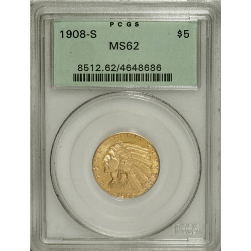 <B>1908-S $5 MS62 PCGS.</B></I> A well struck apricot-gold example of this better date Indian Half Eagle. Uncirculated survivors are even scarcer than the mintage of 82,000 pieces would suggest. A few tiny ticks near the mouth and a thin mark above the olive branch limit the grade. In a green label generation holder.<BR><BR><b>Shipping:</b> Coins & Currency (<a target="_blank" href="http://www.heritageauctions.com/common/shipping.php">view shipping information</a>)