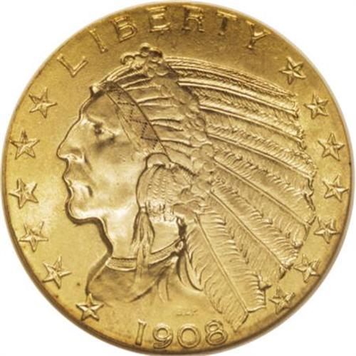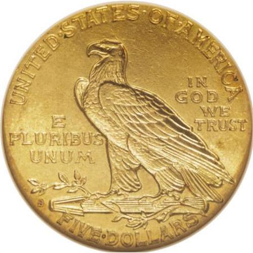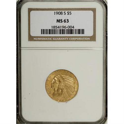 <B>1908-S $5 MS63 NGC.</B></I> The 1908-S comes from a relatively small mintage of 82,000 pieces. The NGC/PCGS population data indicate that this issue is available from VF to Mint State, though not in particularly large numbers in each grade category. The MS63 coin in this lot exhibits lustrous apricot-gold surfaces. Sharp definition is visible on the design elements, though the eagle's shoulder reveals minor softness, which is typical for this issue. A few inoffensive marks define the grade. <BR><BR><b>Shipping:</b> Coins & Currency (<a target="_blank" href="http://www.heritageauctions.com/common/shipping.php">view shipping information</a>)