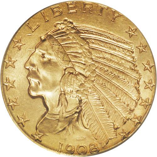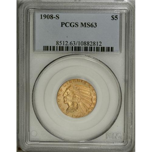 <B>1908-S $5 MS63 PCGS.</B></I> Green-gold and peach toning endows this exactingly struck and lustrous Select Indian half eagle. The reverse field has a few mint-made striations, but post-strike contact is difficult to locate. Only 82,000 pieces were struck for this conditionally rare first-year issue.<BR><BR><b>Shipping:</b> Coin/Currency (<a target="_blank" href="http://www.heritageauctions.com/common/shipping.php">view shipping information</a>)