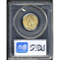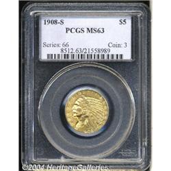 <B>1908-S<$5> MS63 PCGS.</B></I> Bright, minimally marked surfaces display a touch of softness on the eagle's wingtip and a reasonably well defined mintmark. While not quite as scarce in Mint State as its mintage of 82,000 pieces might suggest, the 1908-S is nevertheless a popular first year issue that is quickly is quickly absorbed by the collecting public. <BR><BR><B>Important notice:</B> Heritage usually auctions material at the rate of 200-250 lots per hour. On some occasions eBay Live bid software or the Internet may not be able to keep up with the pace of the auction. We recommend placing a realistic absentee bid now as insurance to avoid disappointment. Occasionally the auctioneer may eliminate or reject an eBay Live bid, and the auctioneer may also reopen a lot after the close of the eBay live bidding (usually because we missed an audience bid), and may reject your bid even if it shows you as the winning bidder. By bidding via eBay Live, you agree that Heritage may award the lot to another bidder at its sole discretion under the circumstances described above or any other reasonable circumstances. Since eBay bids are not shown to us until we open the lot on the floor, we treat those bids just like floor bids. In most cases the floor responds before the eBay bid is presented to us, due to Internet lag time, so for consistency we have made it a policy that floor bids are always considered first over tie eBay live bids. Also please note that all Heritage lots purchased through eBay Live carry a 20% Buyer's Premium. Please make sure you read the Terms and Conditions before you bid.