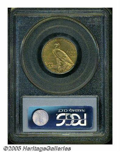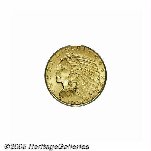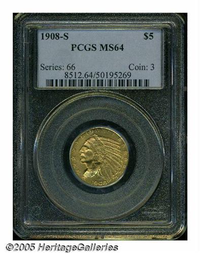 <B>1908-S<$5> MS64 PCGS.</B></I> The 1908-S is a perennially popular issue in the Indian Half Eagle series--primarily because of its low mintage of only 82,000 pieces. This is a curious coin and one with an unusual charm. The surfaces are bright, quite unlike the thick mint frost normally seen on S-mint coinage. Very sharply struck, there are just the slightest abrasions present that prevent an higher grade. Population: 77 in 64, 54 finer (5/05).