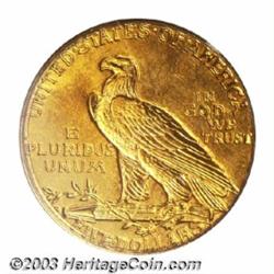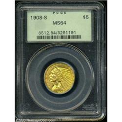 <table><tr><td><TABLE cellSpacing=0 cellPadding=0 width="100%" bgColor=#000000 border=0><TBODY> <TR><TD width="100%"><TABLE cellSpacing=1 cellPadding=3 width="100%" border=0><TBODY><TR><TD width="100%" bgColor=#79735c><FONT face=arial color=#ffffff size=3><B>Description</B> </FONT></TD></TR><TR><TD width="100%" bgColor=#ffffff><FONT face=arial size=2><B>1908-S $5 MS64 PCGS.</B></I> Only 82,000 pieces were struck of this first-year issue. While not quite as difficult as one might imagine (or as rare as it has been touted in the past), the 1908-S is, nevertheless, a very scarce item in a high grade. The surfaces of this piece show the soft, frosted mint luster that characterize this issue and the striking details are sharply defined throughout. A couple of grade-limiting marks are seen on the reverse side.<BR><I>From The Jerry Doty Collection.</B></I> </FONT></TD></TR></TBODY></TABLE></TD></TR></TBODY></TABLE><BR><A name=PricesRealized></A><TABLE cellSpacing=0 cellPadding=0 width="100%" bgColor=#000000 border=0><TBODY><TR><TD width="100%"><TABLE cellSpacing=1 cellPadding=3 width="100%" border=0><TBODY><TR><TD width="100%" bgColor=#79735c><A name=PR><FONT face=arial color=#ffffff size=3><B>Previous Prices from Heritage Auctions</B> </FONT></A></TD></TR><TR><TD bgColor=#f6f6ed><TABLE cellSpacing=0 cellPadding=0 width="100%" border=1><TBODY><TR><TD align=middle width="33%"><B>Date</B></TD><TD align=middle width="33%"><B>Service</B></TD><TD align=middle width="33%"><B>Price</B></TD></TR><TR bgColor=whitesmoke><TD width="33%"><B>09/20/2003</B></TD><TD width="33%">PCGS</TD><TD width="33%">$5,405.00</TD></TR><TR bgColor=whitesmoke><TD width="33%"><B>08/13/1999</B></TD><TD width="33%">PCGS</TD><TD width="33%">$9,487.50</TD></TR><TR bgColor=whitesmoke><TD width="33%"><B>09/01/1999</B></TD><TD width="33%">NGC</TD><TD width="33%">$2,415.00</TD></TR></TBODY></TABLE></TD></TR><TR><TD bgColor=#ffffff><FONT face=arial size=1 ?>PLEASE NOTE: All prices realized reflect the final hammer price PLUS the buyer's premium in auctions that charge a buyer's premium. Each item has a notation at the top of the listing indicating whether that lot included a buyer's premium. Example: A item that sells with a final hammer price of $100 and a 20% buyer's premium will display with a price realized of $120. All information listed is intended to be as accurate as possible, but errors are possible. Please use this guide carefully and inform us of any inaccuracies. </FONT></TD></TR></TBODY></TABLE></TD></TR></TBODY></TABLE><BR><TABLE cellSpacing=0 cellPadding=0 width="100%" bgColor=#000000 border=0><TBODY><TR><TD width="100%"><TABLE cellSpacing=1 cellPadding=3 width="100%" border=0><TBODY><TR><TD width="100%" bgColor=#79735c colSpan=6><FONT face=arial color=#ffffff size=3><B>Price Guide*</B> </FONT></TD></TR><TR bgColor=#f6f6ed><TD align=middle><B>Grade</B> </TD><TD align=middle><B>Coin World<BR>(Trends)</B> </TD><TD align=middle><B>Numismedia<BR>Retail</B> </TD><TD align=middle><B>Numismedia<BR>Wholesale</B> </TD><TD align=middle><B>Coin<BR>Universe</B> </TD><TD align=middle><B>Heritage<BR>Value Index</B> </TD></TR><TR bgColor=#ffffff><TD align=middle>63</TD><TD align=right>$3,225.00</TD><TD align=right>---</TD><TD align=right>$2,250.00</TD><TD align=right>$2,950.00</TD><TD align=right>$2,218.13</TD></TR><TR style="FONT-WEIGHT: bold" bgColor=#cccfdd><TD align=middle>64</TD><TD align=right>$5,000.00</TD><TD align=right>---</TD><TD align=right>$4,425.00</TD><TD align=right>$5,850.00</TD><TD align=right>$3,686.67</TD></TR><TR bgColor=#ffffff><TD align=middle>65</TD><TD align=right>$15,500.00</TD><TD align=right>---</TD><TD align=right>$15,750.00</TD><TD align=right>$16,500.00</TD><TD align=right>$11,343.75</TD></TR><TR bgColor=#ffffff><TD colSpan=6><FONT size=1>*All information listed is intended to be as accurate as possible, but errors are possible. No item may be returned or refused based on this information which is provided as a service to our customers. You should contact each pricing source directly to determine the accuracy of this information. </FONT></TD></TR></TBODY></TABLE></TD></TR></TBODY></TABLE><BR><TABLE cellSpacing=0 cellPadding=0 width="100%" bgColor=#000000 border=0><TBODY><TR><TD width="100%"><TABLE cellSpacing=1 cellPadding=3 width="100%" border=0><TBODY><TR><TD width="100%" bgColor=#79735c><FONT face=arial color=#ffffff size=3><B>Population Guide</B> </FONT></TD></TR><TR bgColor=#ffffff><TD align=middle><!-- Begin Output of Population Grid--><TABLE cellSpacing=0 cellPadding=0 width="100%" border=0><TBODY><TR><TD vAlign=center><TABLE cellSpacing=0 width="100%" border=1 cellsadding="3"><TBODY><TR><TD vAlign=center><TABLE cellSpacing=0 cellPadding=3 width="100%" border=1><TBODY><TR><TD vAlign=center align=middle bgColor=#f0f1e8 colSpan=2 <CENTER><FONT face=Arial size=2><B>PCGS Pop </B></FONT><CENTER></CENTER></TD><TD vAlign=center align=middle bgColor=#f0f1e8 colSpan=2><CENTER><FONT face=Arial size=2><B>NGC Pop</B></CENTER></FONT></TD></TR><TR><TD vAlign=center><FONT face=Arial size=2>(64)</FONT> </TD><TD vAlign=center align=right><FONT face=Arial size=2>60</FONT> </TD><TD vAlign=center><FONT face=Arial size=2>(64)</FONT> </TD><TD vAlign=center align=right><FONT face=Arial size=2>38</FONT> </TD></TR><TR><TD vAlign=center><FONT face=Arial size=2>(>64)</FONT> </TD><TD vAlign=center align=right><FONT face=Arial size=2>49</FONT> </TD><TD vAlign=center><FONT face=Arial size=2>(>64)</FONT> </TD><TD vAlign=center align=right><FONT face=Arial size=2>19</FONT> </TD></TR></TBODY></TABLE></TD></TR></TBODY></TABLE></TD></TR></TBODY></TABLE><!-- End Output of Population Grid--></TD></TR></TBODY></TABLE></TD></TR></TBODY></TABLE><BR><TABLE cellSpacing=0 cellPadding=0 width="100%" bgColor=#000000 border=0><TBODY><TR> Important notice: Heritage usually auctions material at the rate of 200-250 lots per hour. On some occasions eBay Live bid software or the Internet may not be able to keep up with the pace of the auction. We 