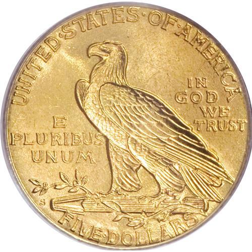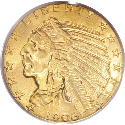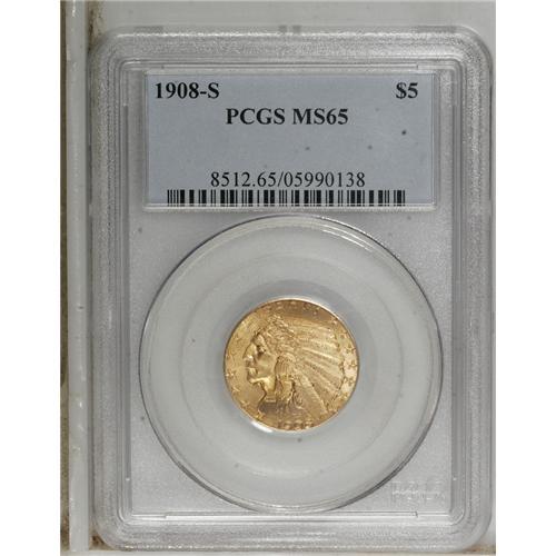 <B>1908-S $5 MS65 PCGS.</B></I> An outstanding peach-gold example of this low (82,000) mintage date. A high degree of mint luster combines with minimally abraded surfaces to provide the more than ample eye appeal desired by discriminating collectors. The 1908-S is scarce as a Gem, as evidenced by the fact that until the multiple offerings in this Platinum Night we've only had the opportunity to offer two pieces in MS65 or higher since 2005, and both were in January's FUN Auction. Collectors seeking the finest quality available for this date will wish to seriously consider a generous bid for this piece.<BR><BR><b>Shipping:</b> Coins & Currency (<a target="_blank" href="http://www.heritageauctions.com/common/shipping.php">view shipping information</a>)