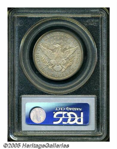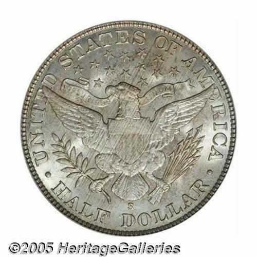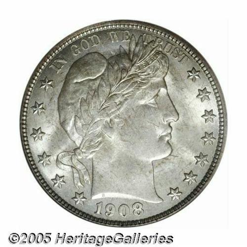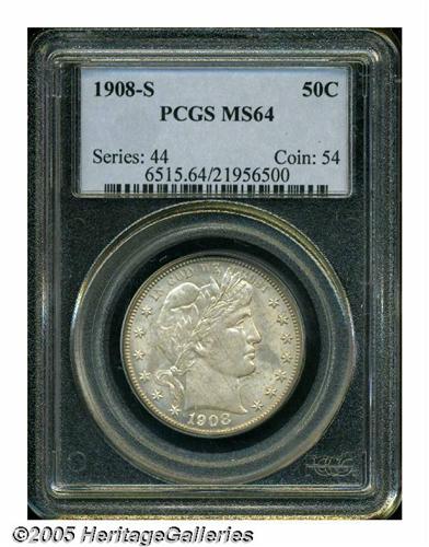 <B>1908-S<50C> MS64 PCGS.</B></I> This issue's original mintage of 1.6 million pieces is average for the series, but, unlike many Barber Halves, the 1908-S was not spared from circulation in anything approaching significant numbers. As a result, this date is a noteworthy condition rarity in the finer Mint State grades. The current example is typically struck, and lightly marked. A thin coating of silver-gray toning overlays both sides. The luster is satiny and quite pleasing. Population: 12 in 64, 11 finer (5/05).