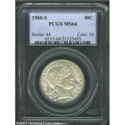 <table><tr><td><TABLE cellSpacing=0 cellPadding=0 width="100%" bgColor=#000000 border=0><TBODY> <TR><TD width="100%"><TABLE cellSpacing=1 cellPadding=3 width="100%" border=0><TBODY><TR><TD width="100%" bgColor=#79735c><FONT face=arial color=#ffffff size=3><B>Description</B> </FONT></TD></TR><TR><TD width="100%" bgColor=#ffffff><FONT face=arial size=2><B>1908-S 50C MS64 PCGS.</B></I> This issue's original mintage of 1.6 million pieces is average for the series, but, unlike many Barber halves, the 1908-S was not spared from circulation in anything approaching significant numbers. As a result, this date is a noteworthy condition rarity in the finer Mint State grades. The current example is typically struck, and lightly marked. Speckled and streaky reddish-brown toning overlays both sides. The luster is satiny and quite pleasing. Population: 11 in 64, 11 finer (9/03). </FONT></TD></TR></TBODY></TABLE></TD></TR></TBODY></TABLE><BR><A name=PricesRealized></A><TABLE cellSpacing=0 cellPadding=0 width="100%" bgColor=#000000 border=0><TBODY><TR><TD width="100%"><TABLE cellSpacing=1 cellPadding=3 width="100%" border=0><TBODY><TR><TD width="100%" bgColor=#79735c><A name=PR><FONT face=arial color=#ffffff size=3><B>Previous Prices from Heritage Auctions</B> </FONT></A></TD></TR><TR><TD bgColor=#f6f6ed><TABLE cellSpacing=0 cellPadding=0 width="100%" border=1><TBODY><TR><TD align=middle width="33%"><B>Date</B></TD><TD align=middle width="33%"><B>Service</B></TD><TD align=middle width="33%"><B>Price</B></TD></TR><TR bgColor=whitesmoke><TD width="33%"><B>03/01/1998</B></TD><TD width="33%">PCGS</TD><TD width="33%">$2,860.00</TD></TR></TBODY></TABLE></TD></TR><TR><TD bgColor=#ffffff><FONT face=arial size=1 ?>PLEASE NOTE: All prices realized reflect the final hammer price PLUS the buyer's premium in auctions that charge a buyer's premium. Each item has a notation at the top of the listing indicating whether that lot included a buyer's premium. Example: A item that sells with a final hammer price of $100 and a 20% buyer's premium will display with a price realized of $120. All information listed is intended to be as accurate as possible, but errors are possible. Please use this guide carefully and inform us of any inaccuracies. </FONT></TD></TR></TBODY></TABLE></TD></TR></TBODY></TABLE><BR><TABLE cellSpacing=0 cellPadding=0 width="100%" bgColor=#000000 border=0><TBODY><TR><TD width="100%"><TABLE cellSpacing=1 cellPadding=3 width="100%" border=0><TBODY><TR><TD width="100%" bgColor=#79735c colSpan=6><FONT face=arial color=#ffffff size=3><B>Price Guide*</B> </FONT></TD></TR><TR bgColor=#f6f6ed><TD align=middle><B>Grade</B> </TD><TD align=middle><B>Coin World<BR>(Trends)</B> </TD><TD align=middle><B>Numismedia<BR>Retail</B> </TD><TD align=middle><B>Numismedia<BR>Wholesale</B> </TD><TD align=middle><B>Coin<BR>Universe</B> </TD><TD align=middle><B>Heritage<BR>Value Index</B> </TD></TR><TR bgColor=#ffffff><TD align=middle>63</TD><TD align=right>$2,100.00</TD><TD align=right>---</TD><TD align=right>$1,825.00</TD><TD align=right>$2,150.00</TD><TD align=right>$1,447.67</TD></TR><TR style="FONT-WEIGHT: bold" bgColor=#cccfdd><TD align=middle>64</TD><TD align=right>$4,000.00</TD><TD align=right>---</TD><TD align=right>$2,500.00</TD><TD align=right>$3,650.00</TD><TD align=right>$2,520.00</TD></TR><TR bgColor=#ffffff><TD align=middle>65</TD><TD align=right>$6,500.00</TD><TD align=right>---</TD><TD align=right>$3,500.00</TD><TD align=right>$6,325.00</TD><TD align=right>$4,267.50</TD></TR><TR bgColor=#ffffff><TD colSpan=6><FONT size=1>*All information listed is intended to be as accurate as possible, but errors are possible. No item may be returned or refused based on this information which is provided as a service to our customers. You should contact each pricing source directly to determine the accuracy of this information. </FONT></TD></TR></TBODY></TABLE></TD></TR></TBODY></TABLE><BR><TABLE cellSpacing=0 cellPadding=0 width="100%" bgColor=#000000 border=0><TBODY><TR><TD width="100%"><TABLE cellSpacing=1 cellPadding=3 width="100%" border=0><TBODY><TR><TD width="100%" bgColor=#79735c><FONT face=arial color=#ffffff size=3><B>Population Guide</B> </FONT></TD></TR><TR bgColor=#ffffff><TD align=middle><!-- Begin Output of Population Grid--><TABLE cellSpacing=0 cellPadding=0 width="100%" border=0><TBODY><TR><TD vAlign=center><TABLE cellSpacing=0 width="100%" border=1 cellsadding="3"><TBODY><TR><TD vAlign=center><TABLE cellSpacing=0 cellPadding=3 width="100%" border=1><TBODY><TR><TD vAlign=center align=middle bgColor=#f0f1e8 colSpan=2 <CENTER><FONT face=Arial size=2><B>PCGS Pop </B></FONT><CENTER></CENTER></TD><TD vAlign=center align=middle bgColor=#f0f1e8 colSpan=2><CENTER><FONT face=Arial size=2><B>NGC Pop</B></CENTER></FONT></TD></TR><TR><TD vAlign=center><FONT face=Arial size=2>(64)</FONT> </TD><TD vAlign=center align=right><FONT face=Arial size=2>16</FONT> </TD><TD vAlign=center><FONT face=Arial size=2>(64)</FONT> </TD><TD vAlign=center align=right><FONT face=Arial size=2>13</FONT> </TD></TR><TR><TD vAlign=center><FONT face=Arial size=2>(>64)</FONT> </TD><TD vAlign=center align=right><FONT face=Arial size=2>12</FONT> </TD><TD vAlign=center><FONT face=Arial size=2>(>64)</FONT> </TD><TD vAlign=center align=right><FONT face=Arial size=2>6</FONT> </TD></TR></TBODY></TABLE></TD></TR></TBODY></TABLE></TD></TR></TBODY></TABLE><!-- End Output of Population Grid--></TD></TR></TBODY></TABLE></TD></TR></TBODY></TABLE><BR><TABLE cellSpacing=0 cellPadding=0 width="100%" bgColor=#000000 border=0><TBODY><TR> Important notice: Heritage usually auctions material at the rate of 200-250 lots per hour. On some occasions eBay Live bid software or the Internet may not be able to keep up with the pace of the auction. We recommend placing a realistic absentee bid now as insurance to avoid disappointment. Occasionally the auctioneer may eliminate or reject an eBay Live bid, and the auctioneer may also reopen a lot after the close of the eBay live bi