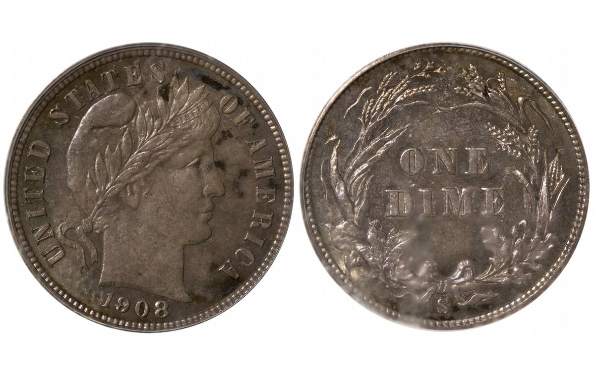 1908 A well struck MS65 gem with attractive toning. Gem Barber Dimes can be quite elusive and this would be a welcome addition to a high grade type set. HKA#63480