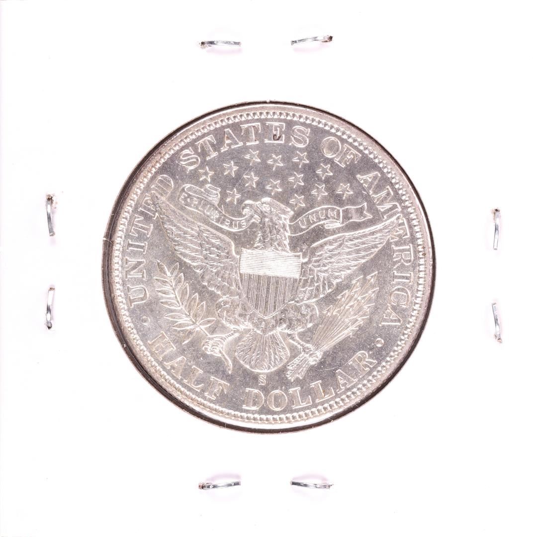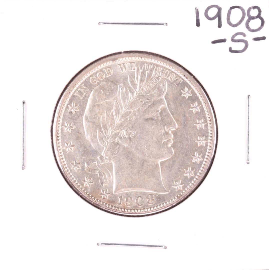 One 1908-S Barber Half Dollar Coin.