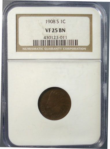 1908-S INDIAN HEAD CENT, NGC VF 25 BN