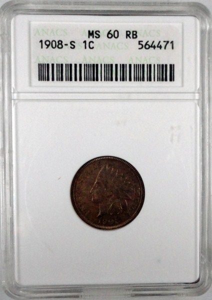 1908-S INDIAN ONE CENT ANACS MS-60 RB NICE!
