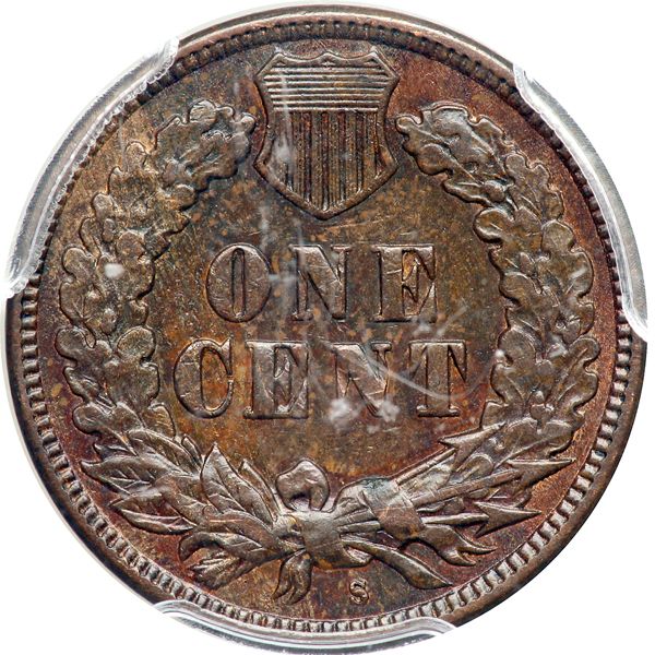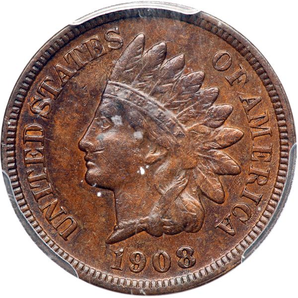 1908-S Indian Head Cent. PCGS graded AU-50. The first branch Mint date in the Indian cent series, and always desirable in high grades (PCGS # 2232) .