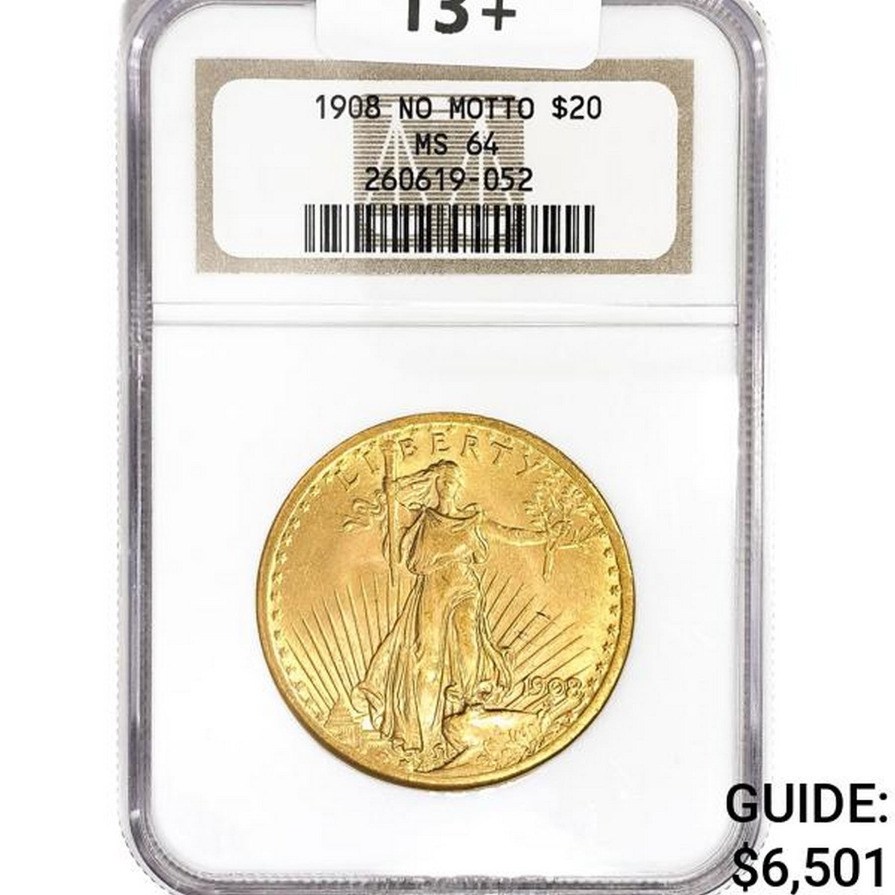 1908 SG $20 Gold Double Eagle NGC MS64 No Motto