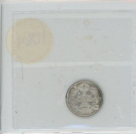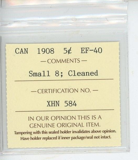 1908 SM8 ICCS GRADED CANADIAN FIVE CENT COIN - EF40