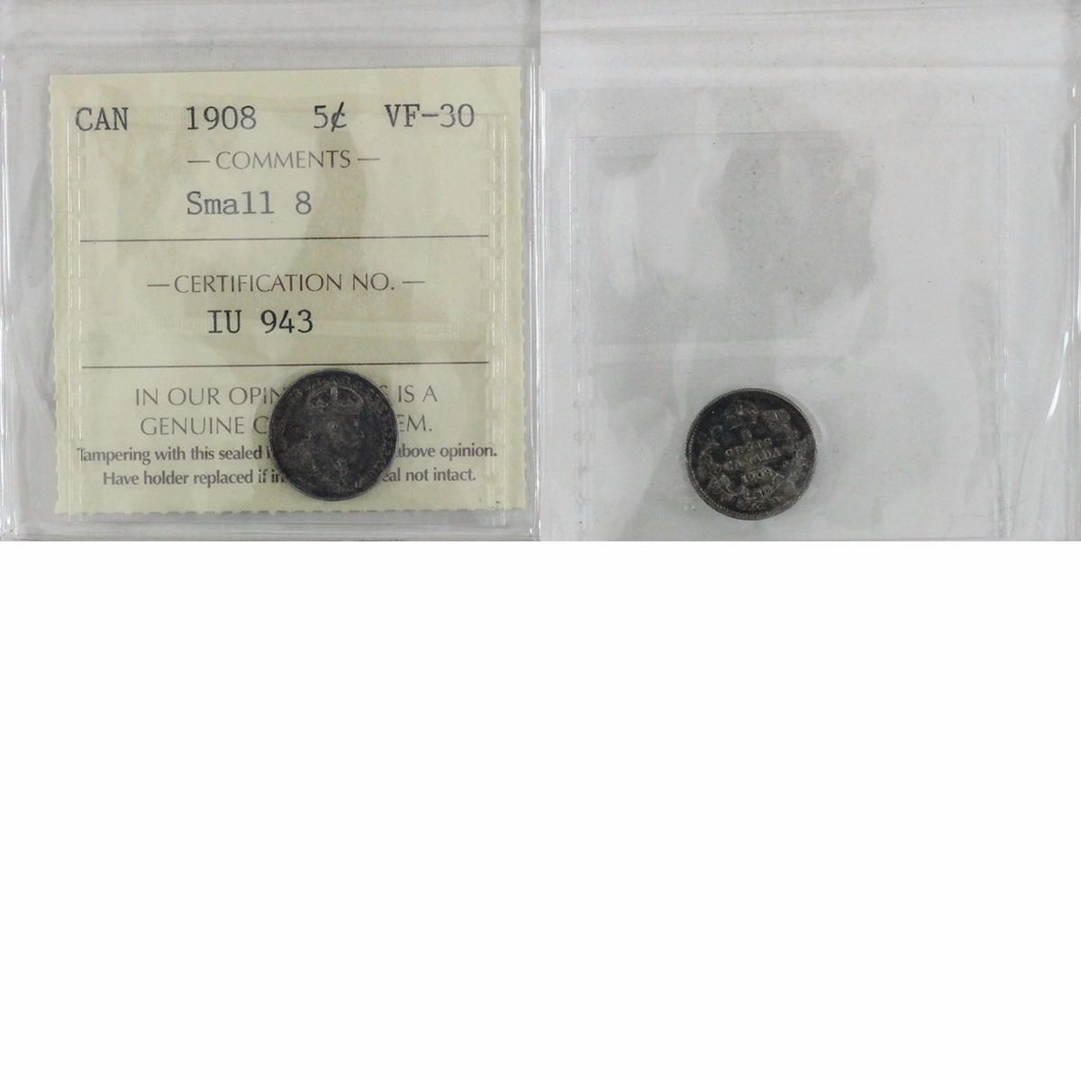 1908 Small 8 Canada 5-cent ICCS Certified VF-30. Buyers Premium will be added on all items as per our terms of sale. We accept Paypal, Credit Card, E-Transfer Payments, Cheque or Money Orders (there is an additional 3% fee for using Paypal or Credit Card). All invoices will be emailed immediately following the auction, please contact us if you would like to pay by credit card or receive a new revised lower total for mailing in payment or sending an e-transfer (3% discount). All Items Are Sold "AS IS", no returns
