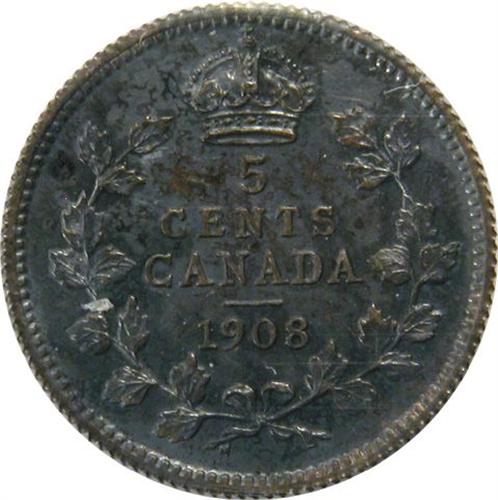 Canada 1908 Small 8 Specimen Set with Original Case, CH 6c. The One Cent is ICCS SP-65 Red Lacquered, and is full red; the 5 Cents and 10 Cents are ICCS SP-64 and the 25 Cents and 50 Cents are ICCS SP-65. The silver is attractively toned in medium-dark mauve-golds and blues. The 5 Cents is the Small 8 variety, and is finest of only three certified examples