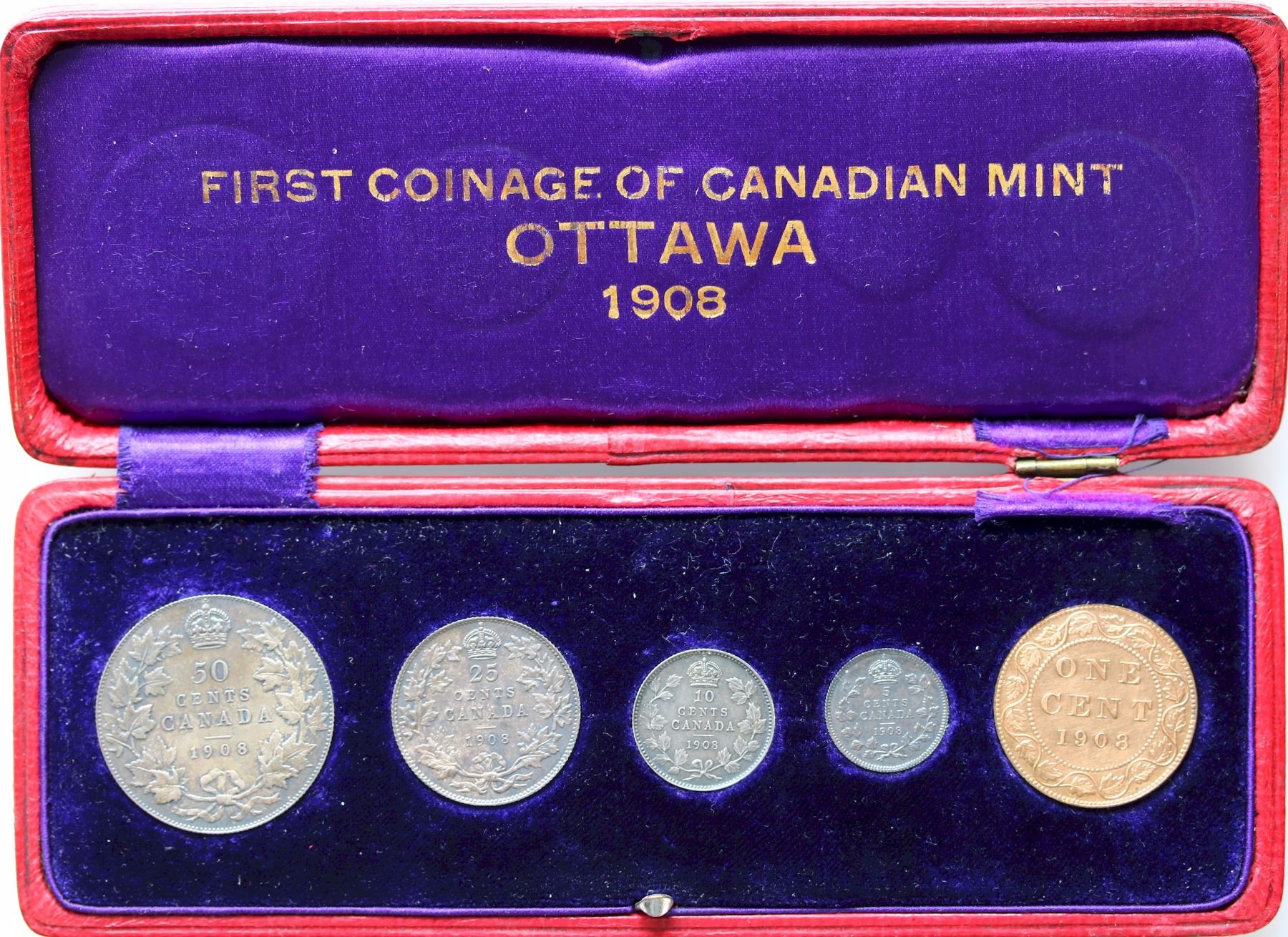 1908 Specimen Matte Set. Spectacular 5 coins set. The Cent is Red, while the silver coins have developed a marvellous storm grey tint and bluish features. All coins are in great condition. Housed in its original presentation box.