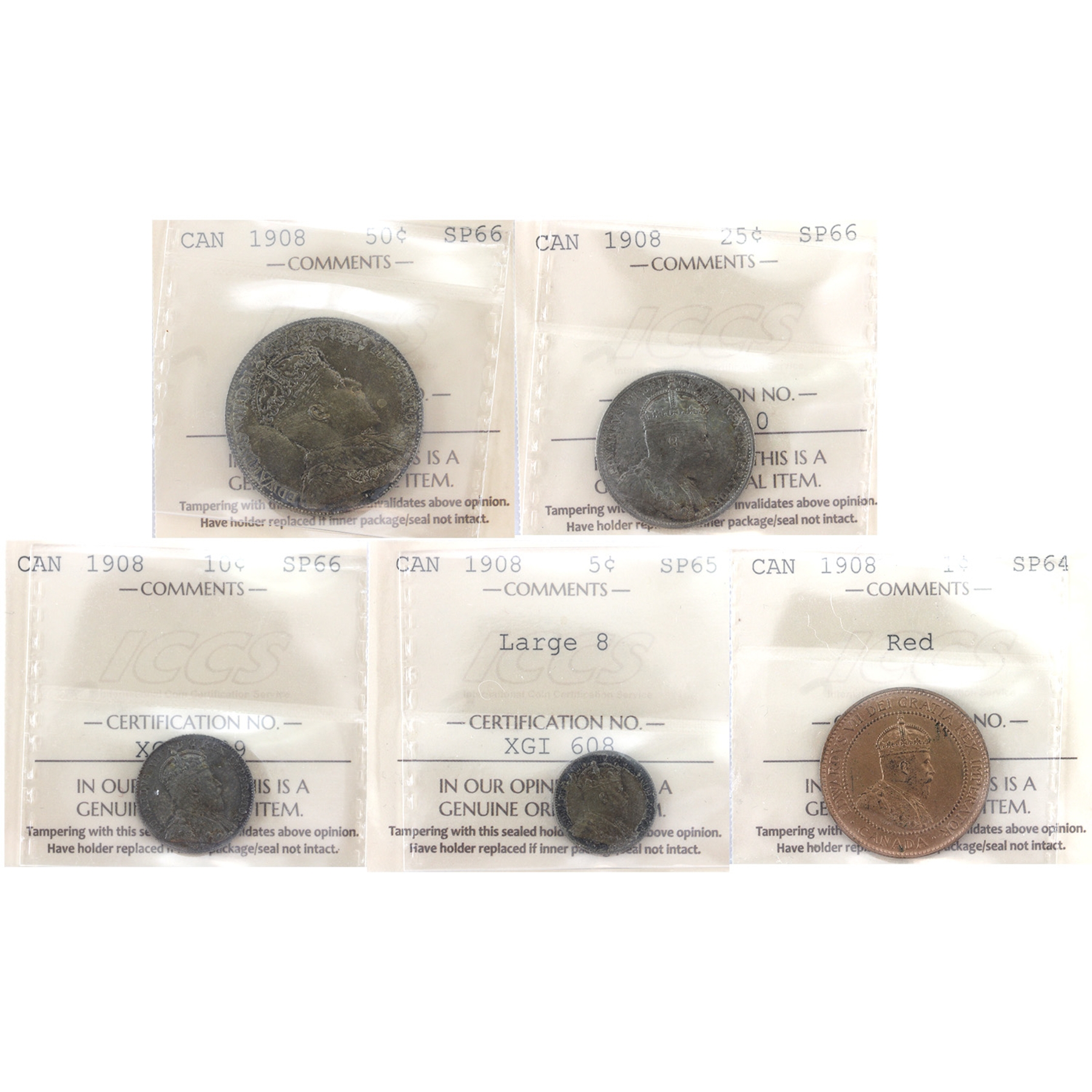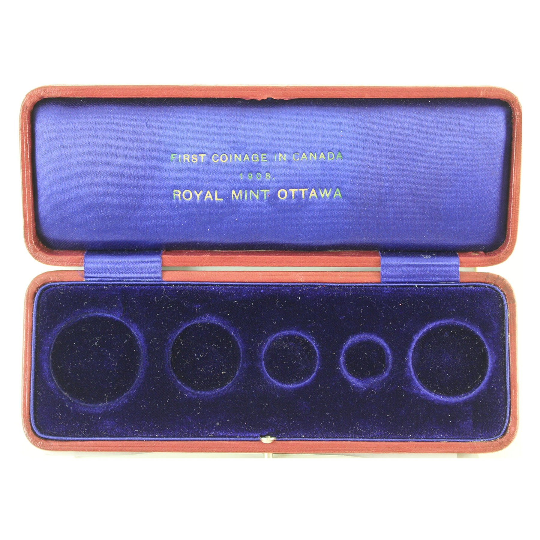 INCLUDES: 50-cent SP66, 25-cent SP66, 10-cent SP66, 5-cent SP65 Large 8 & 1-cent SP64 Red. All coins have consistent natural Patina expected in these sets. CASE Charlton #6c . Red leather with blue statin interior; impressed in gold lettering: FIRST COINAGE OF CANADIAN MINT 1908 ROYAL MINT OTTAWA. A great investment piece!