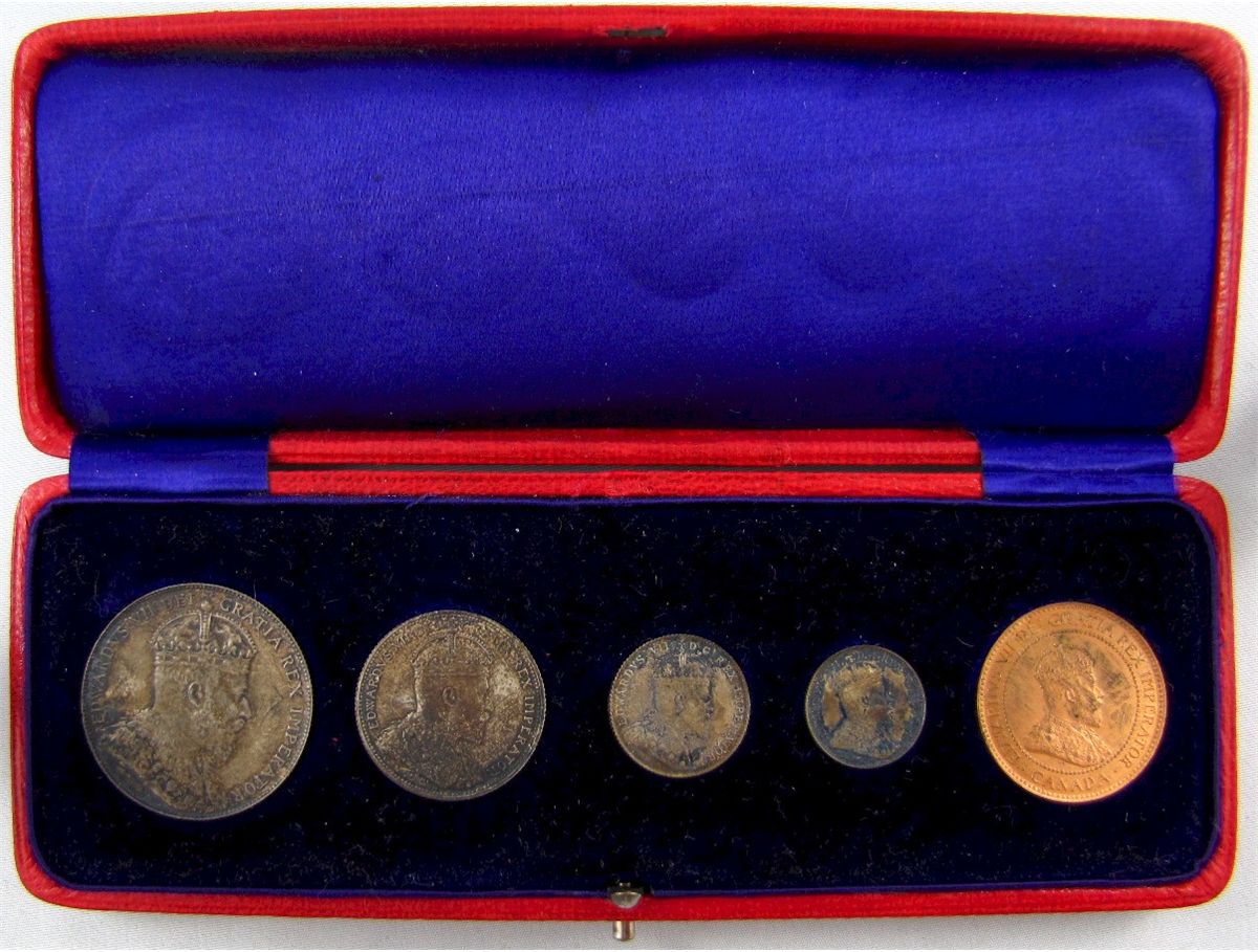 1908 Specimen Set complete in Original Red Case. Nicely toned silver examples and the cent is RD.