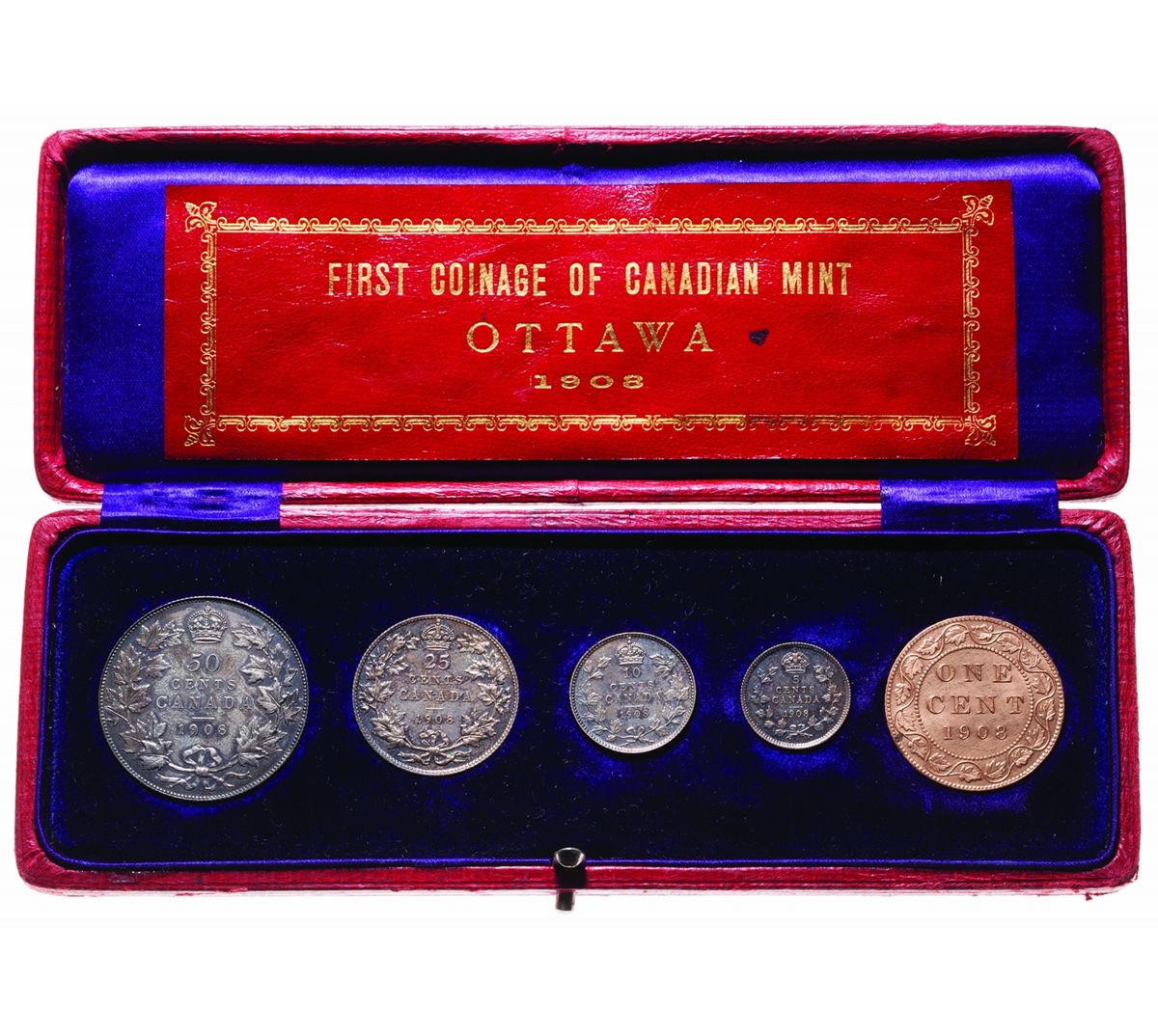 1908 Specimen Set. Includes 1 Cent, 5 Cent, 10 Cent, 25 Cent, 50 Cent and orginal red presentation case. The 1 cent is fully red, while the silver coins have developed a marvellous toning of storm grey with gunmetal blue highlights. All coins are Brilliant Choice to Gem condition. From the Rosedale Collection.