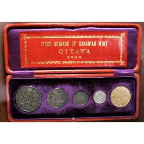 1908 Specimen set (Charlton #6c)Includes 5 coins, 1¢ thru 50¢. The large cent is red while the silver coins are toned. Grades vary from SP-62 to SP-65. The box is decent.