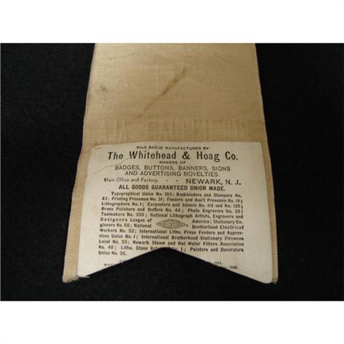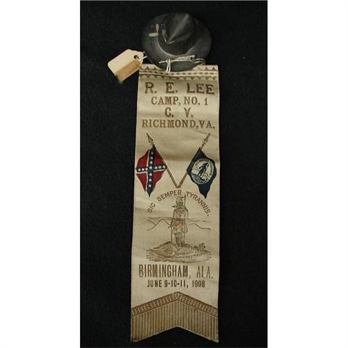 UNITED CONFEDERATE VETERANS 18TH ANNUAL REUNION RIBBON. Held June 9-11, 1908 in Birmingham, Alabama. Ribbon is marked “R.E. Lee/Camp, No. 1/C.V./Richmond, VA.” at top and “Birmingham, Ala./June 9-10-11, 1908” at bottom. Ribbon is decorated with a Confederate battle flag and the state flag of Virginia. Ribbon is marked beneath flags “Sic Semper Tyrannis”. An small ornamental Confederate officer’s slouch hat is attached to the top of the ribbon with a pin. Ribbon retains its original Whitehead & Hoag Co. label at bottom of verso. Ribbon: 8” L