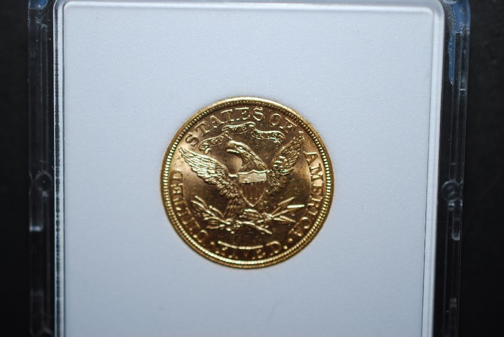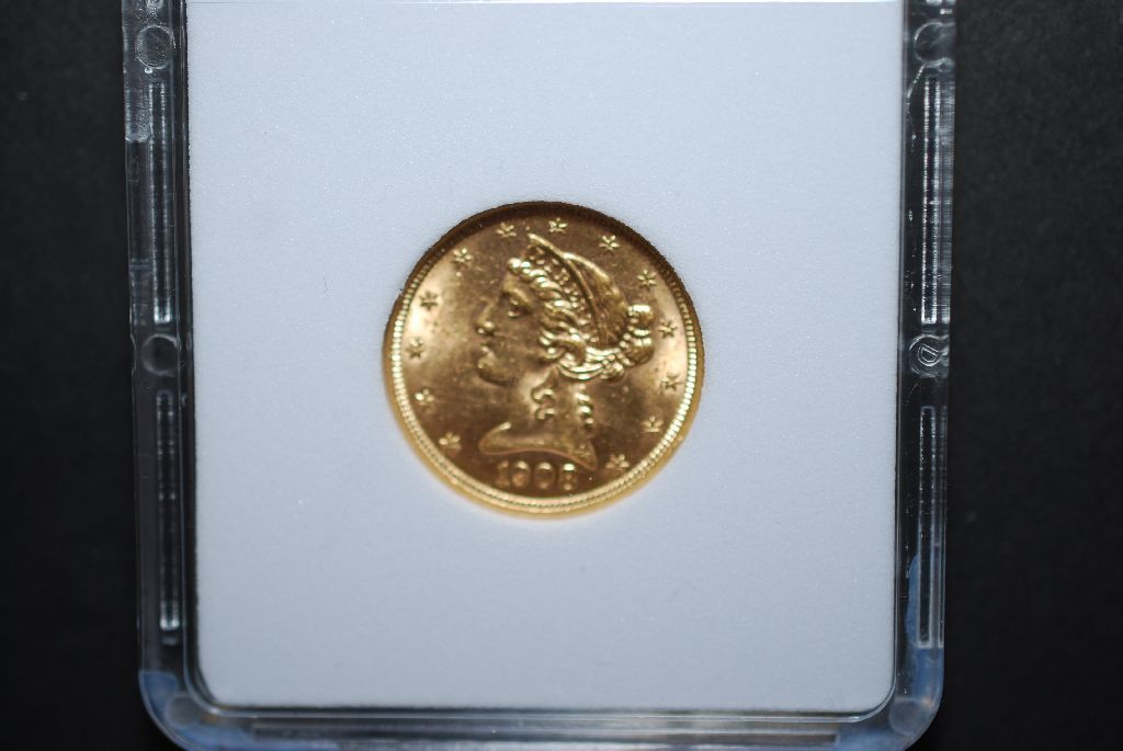 1908 US Liberty $5 Gold Coin; MCPCG Graded MS62; EST. $550-650