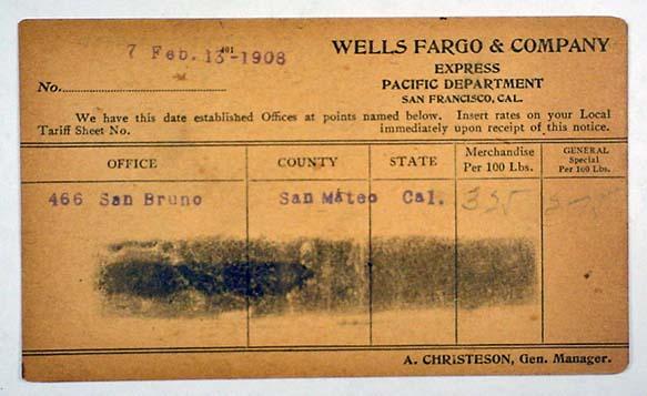 1908 WELLS FARGO AND CO. EXPRESS CARD SENT TO AGENT OF WELLS FARGO AND CO. - Nice early Wells Fargo Advertising.