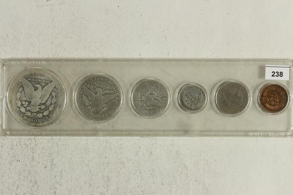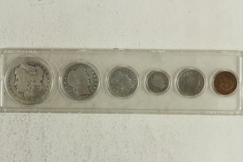 NICKEL, BARBER DIME, BARBER QUARTER, BARBER HALF DOLLAR AND UNDATED MORGAN SILVER DOLLAR