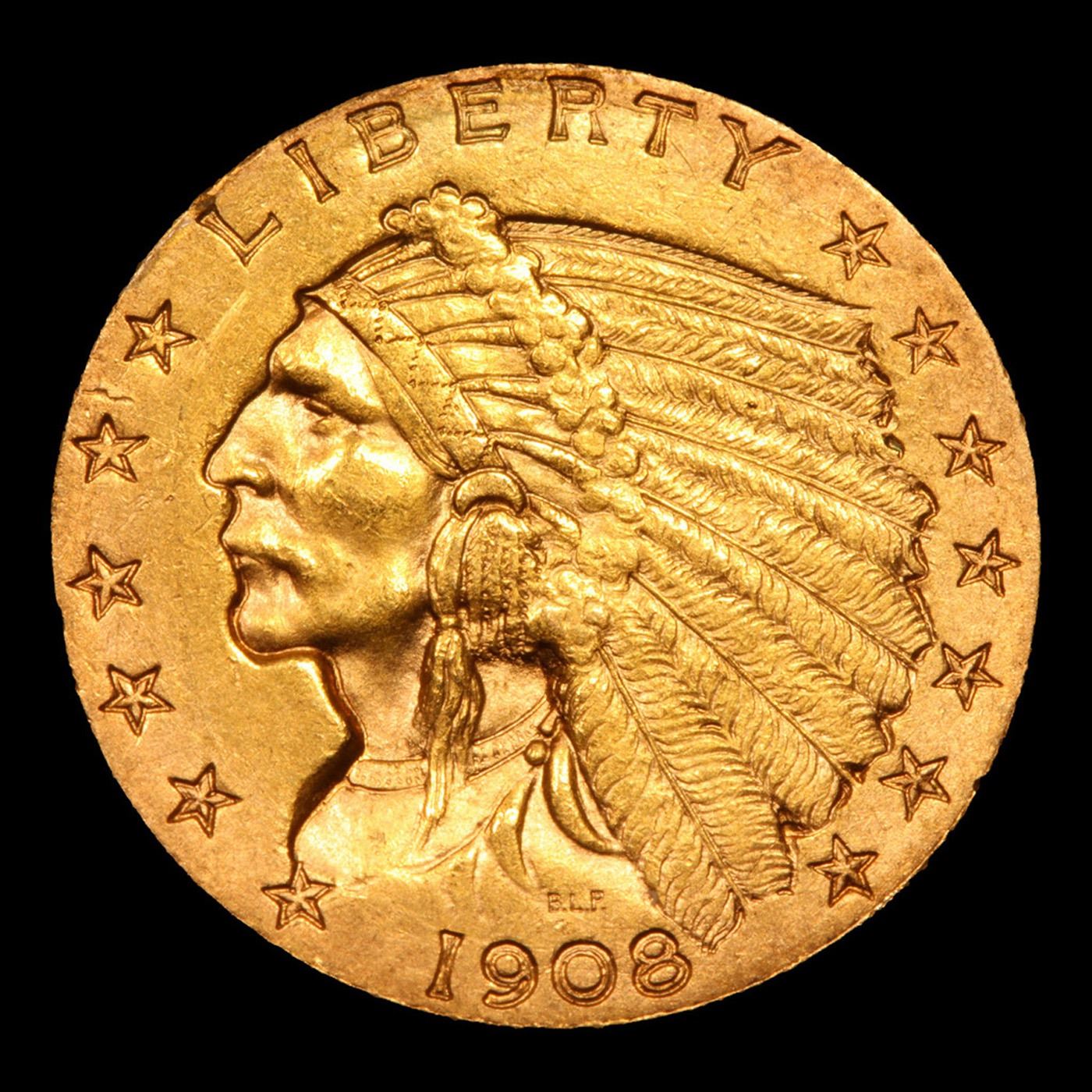1908-p Gold Indian Quarter Eagle $2 1/2 Grades Choice AU/BU Slider.