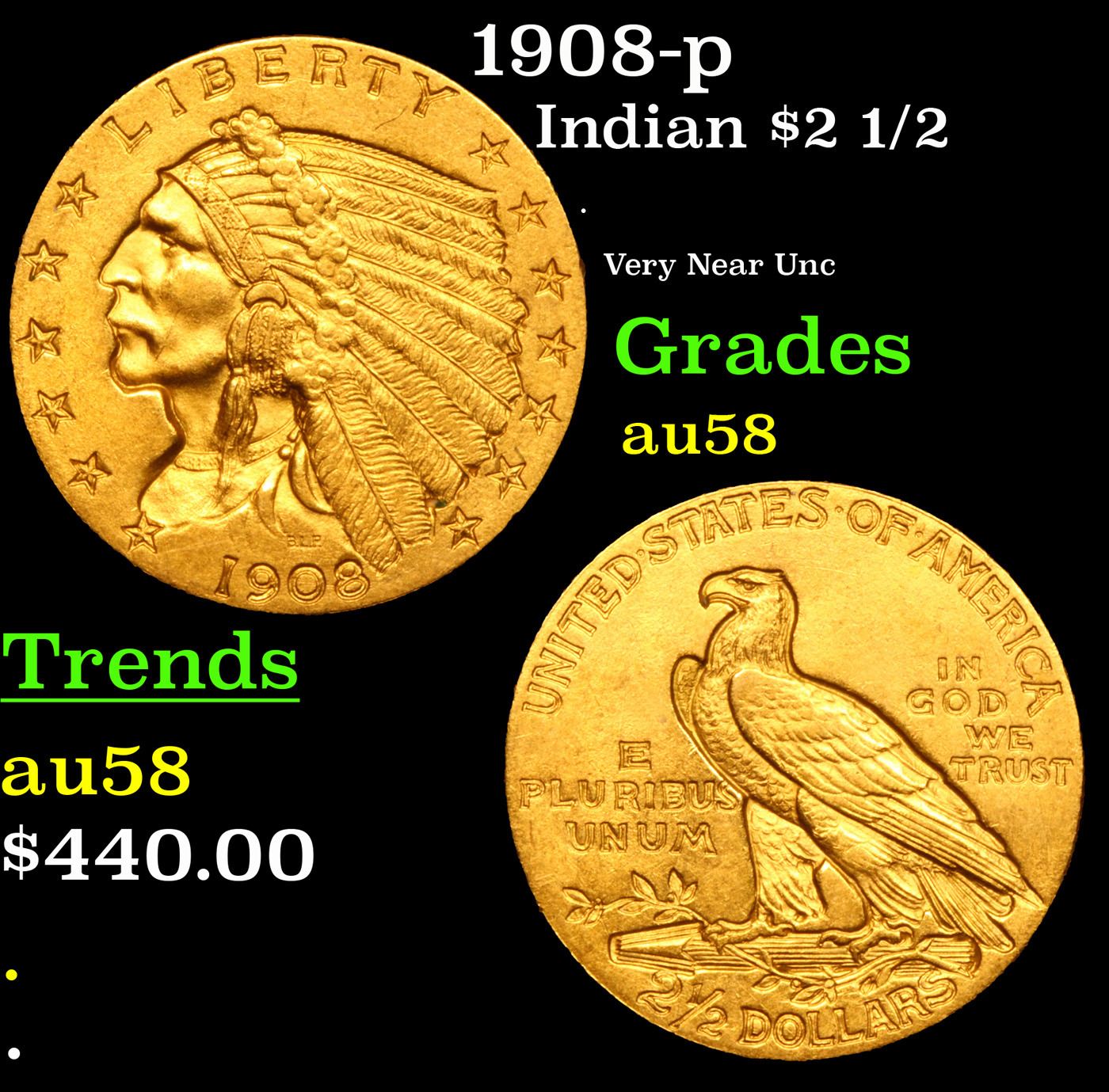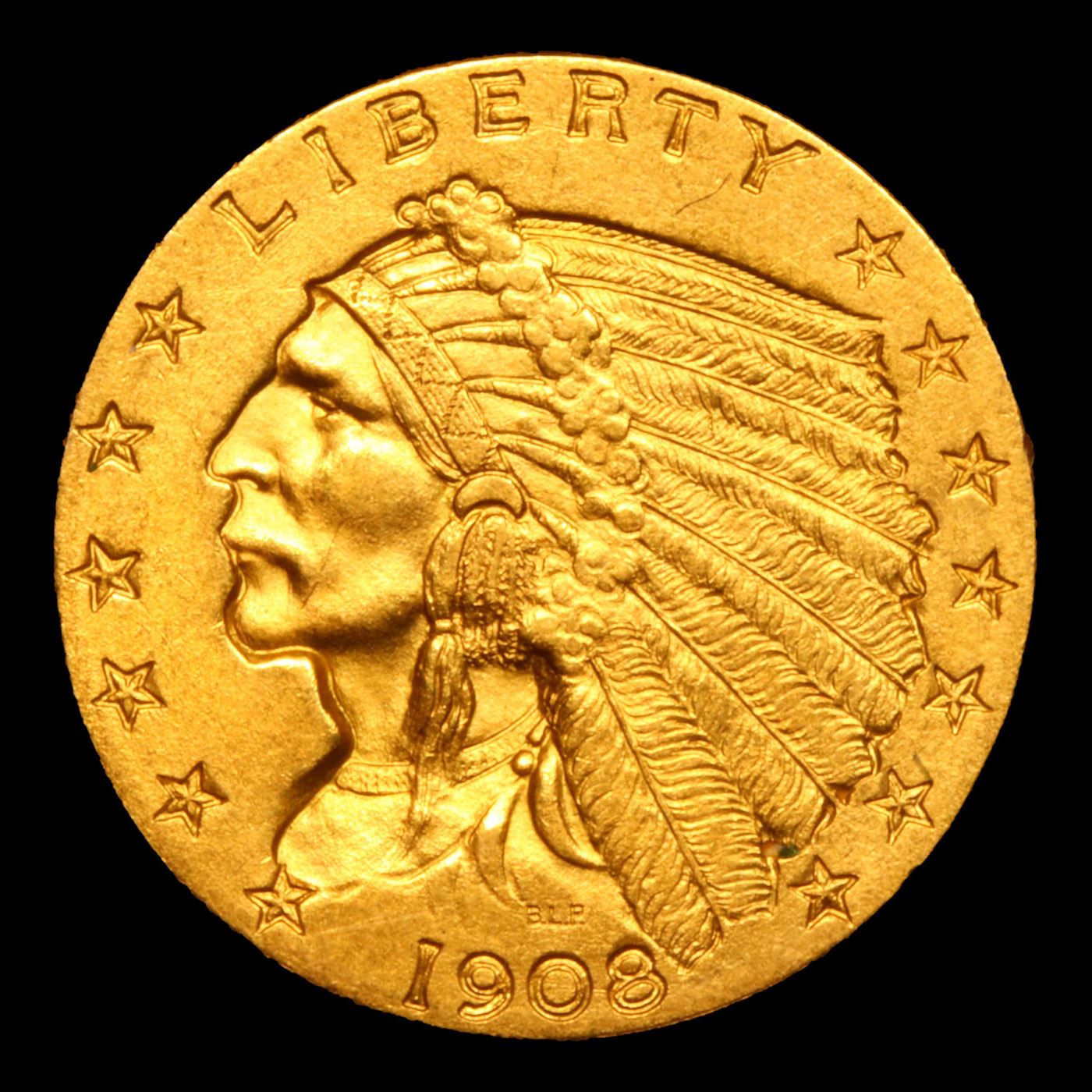 1908-p Gold Indian Quarter Eagle $2 1/2 Grades Choice AU/BU Slider.