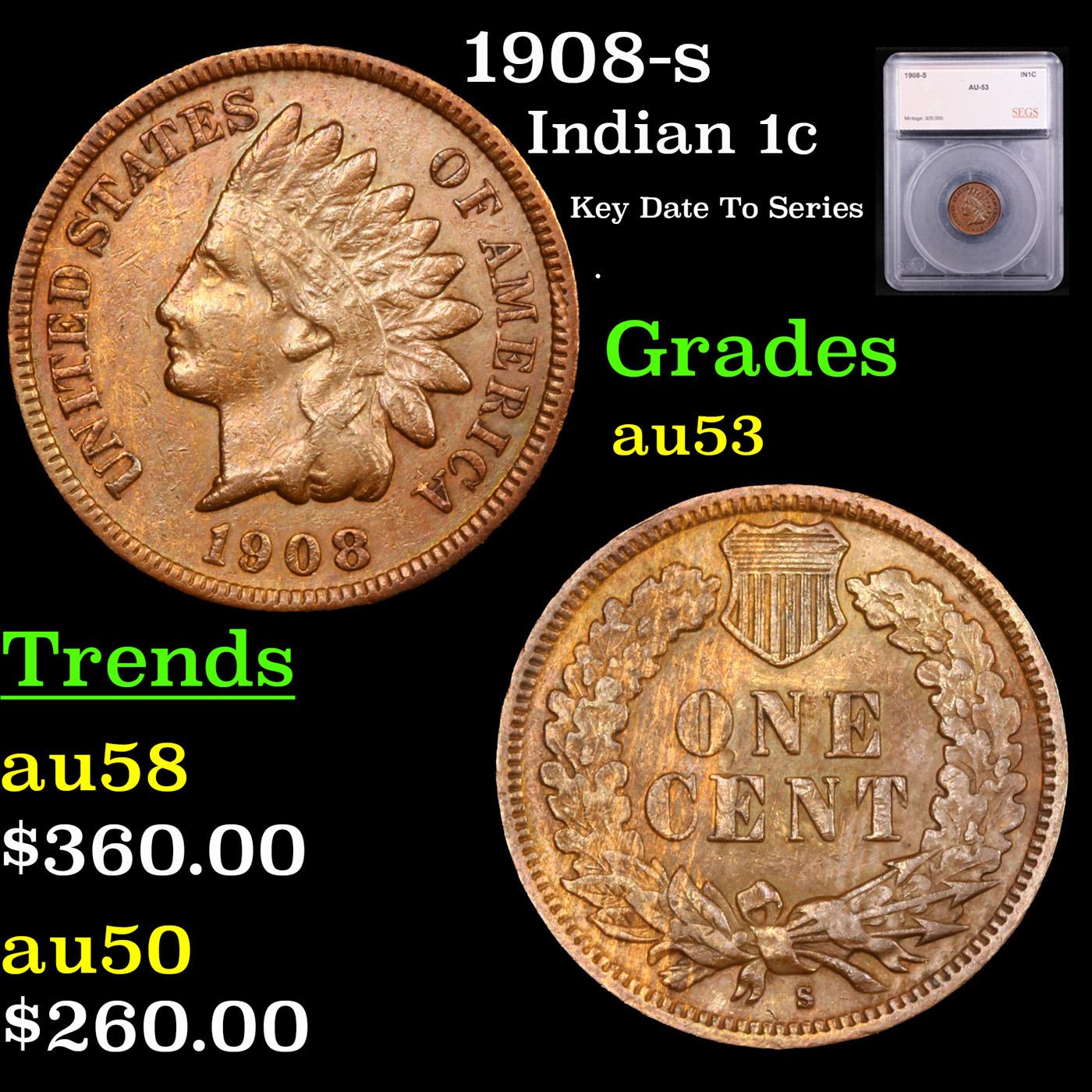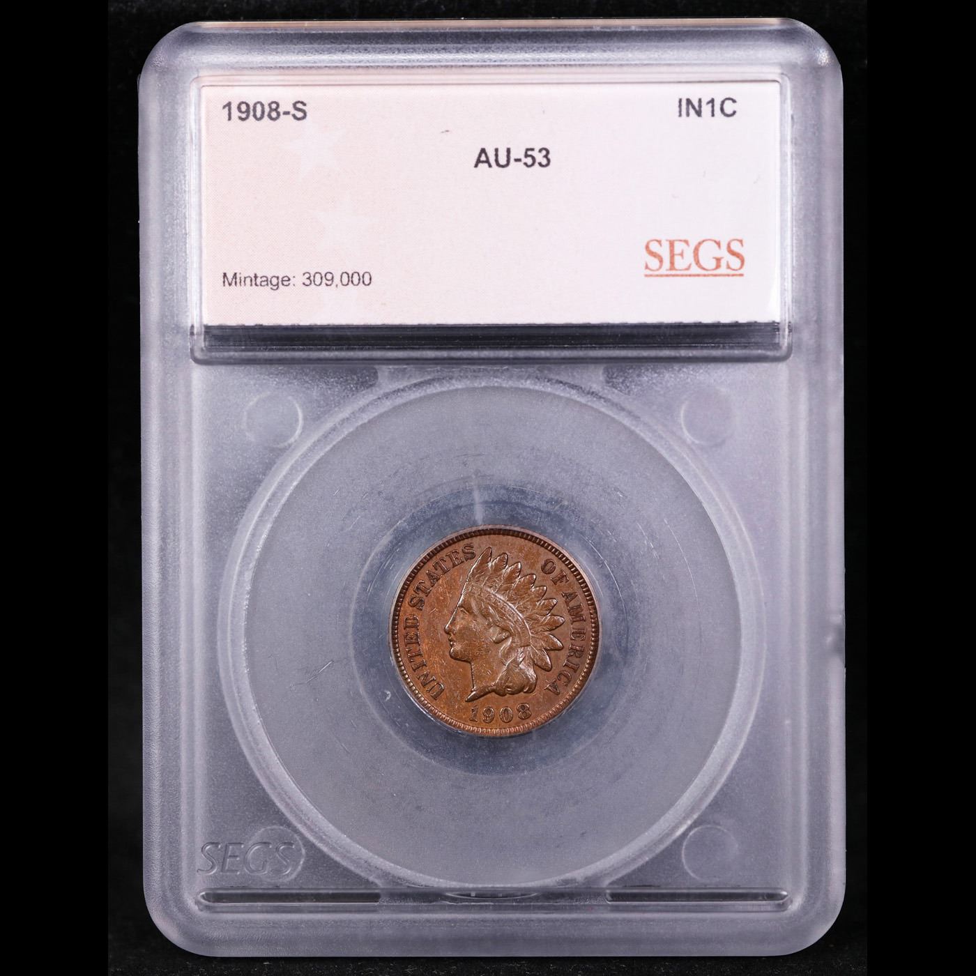 1908-s Indian Cent 1c Graded au53 BY SEGS. very scarce. Per PCGS :"The 1908-S Indian cent is the third lowest mintage circulation strike Indian cent. The only two other lower mintage coins in the series are the 1877 and the 1909-S, with the latter being the lowest mintage in the entire series." also PCGS estimates only 3000 survive in all grades