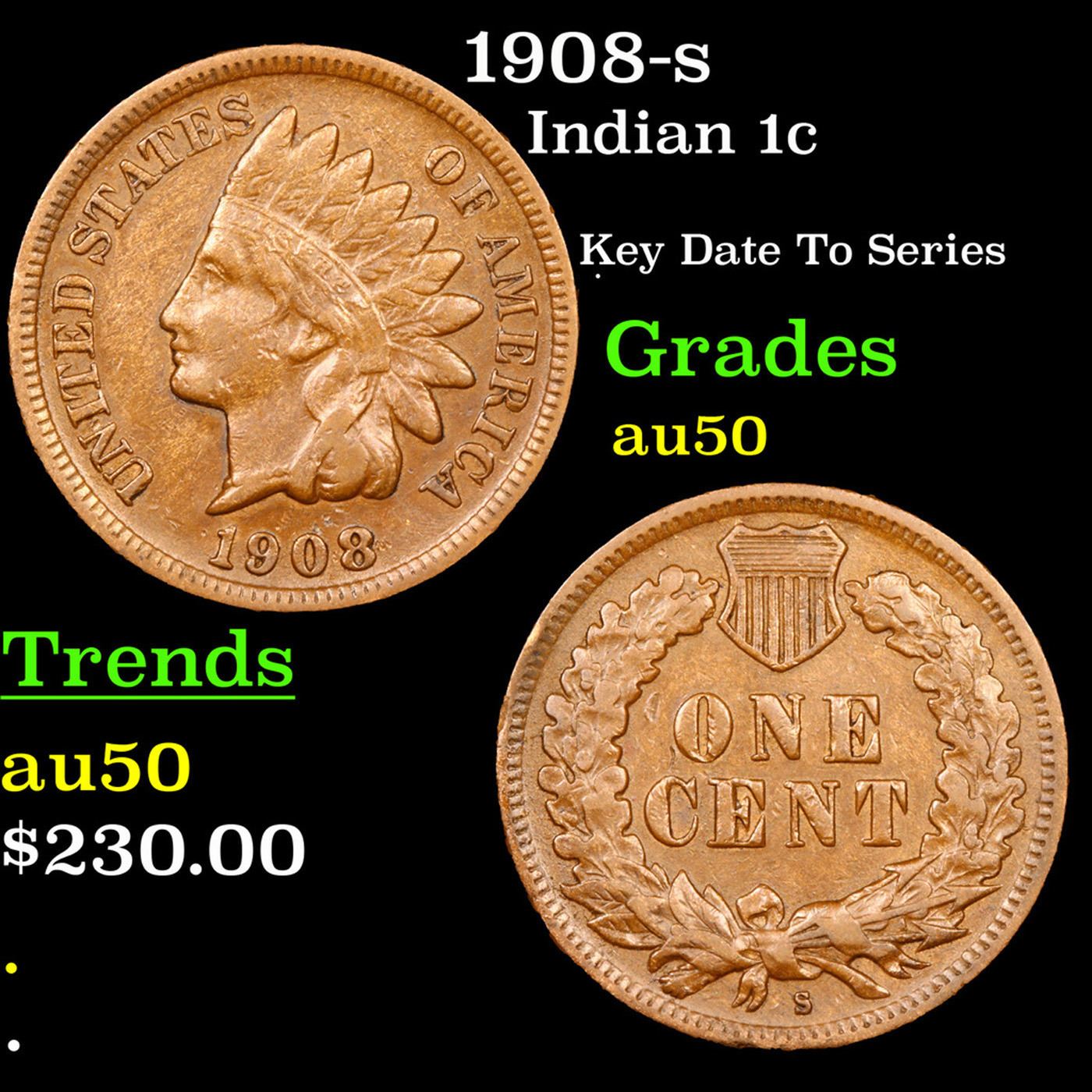 1908-s Indian Cent 1c Grades AU, Almost Unc. very scarce. Per PCGS :"The 1908-S Indian cent is the third lowest mintage circulation strike Indian cent. The only two other lower mintage coins in the series are the 1877 and the 1909-S, with the latter being the lowest mintage in the entire series." also PCGS estimates only 3000 survive in all grades
