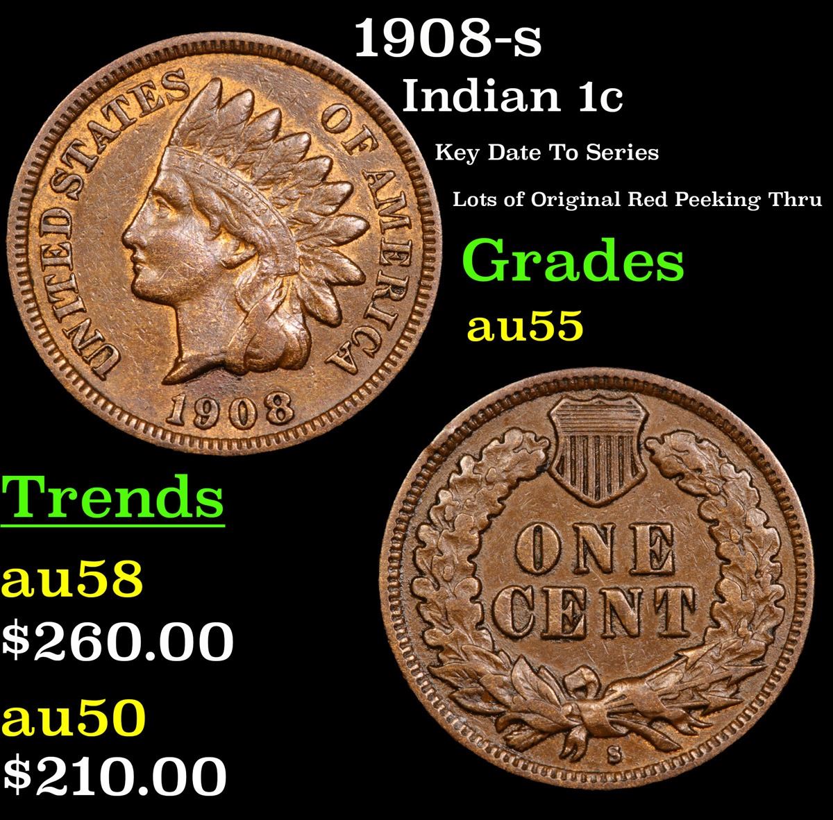 1908-s Indian Cent 1c Grades Choice AU.  very scarce. Per PCGS :"The 1908-S Indian cent is the third lowest mintage circulation strike Indian cent. The only two other lower mintage coins in the series are the 1877 and the 1909-S, with the latter being the lowest mintage in the entire series." also PCGS estimates only 3000 survive in all grades