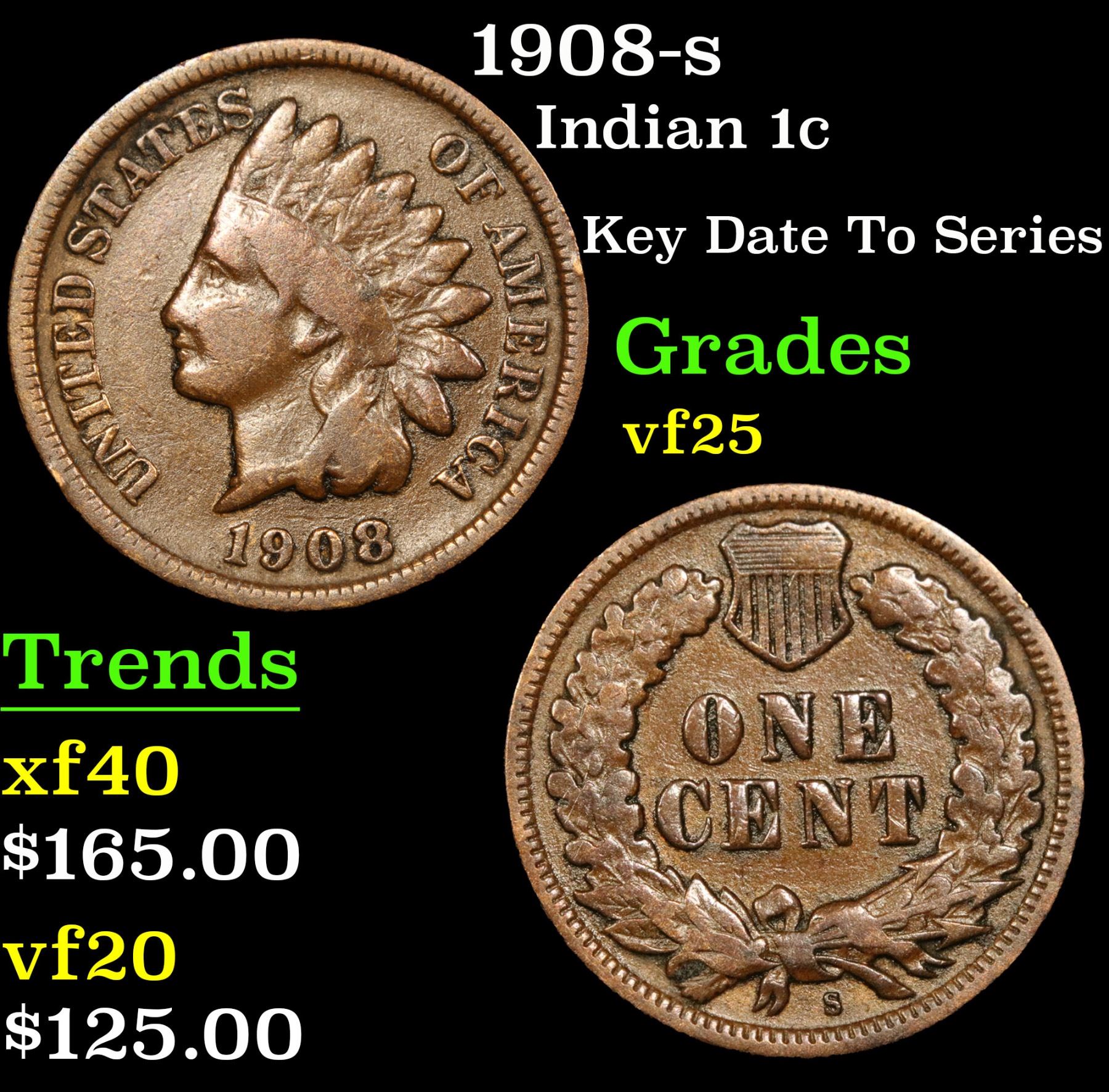 1908-s Indian Cent 1c Grades vf+. Key Date To Series very scarce. Per PCGS :"The 1908-S Indian cent is the third lowest mintage circulation strike Indian cent. The only two other lower mintage coins in the series are the 1877 and the 1909-S, with the latter being the lowest mintage in the entire series." also PCGS estimates only 3000 survive in all grades
