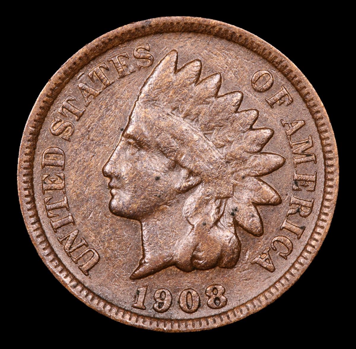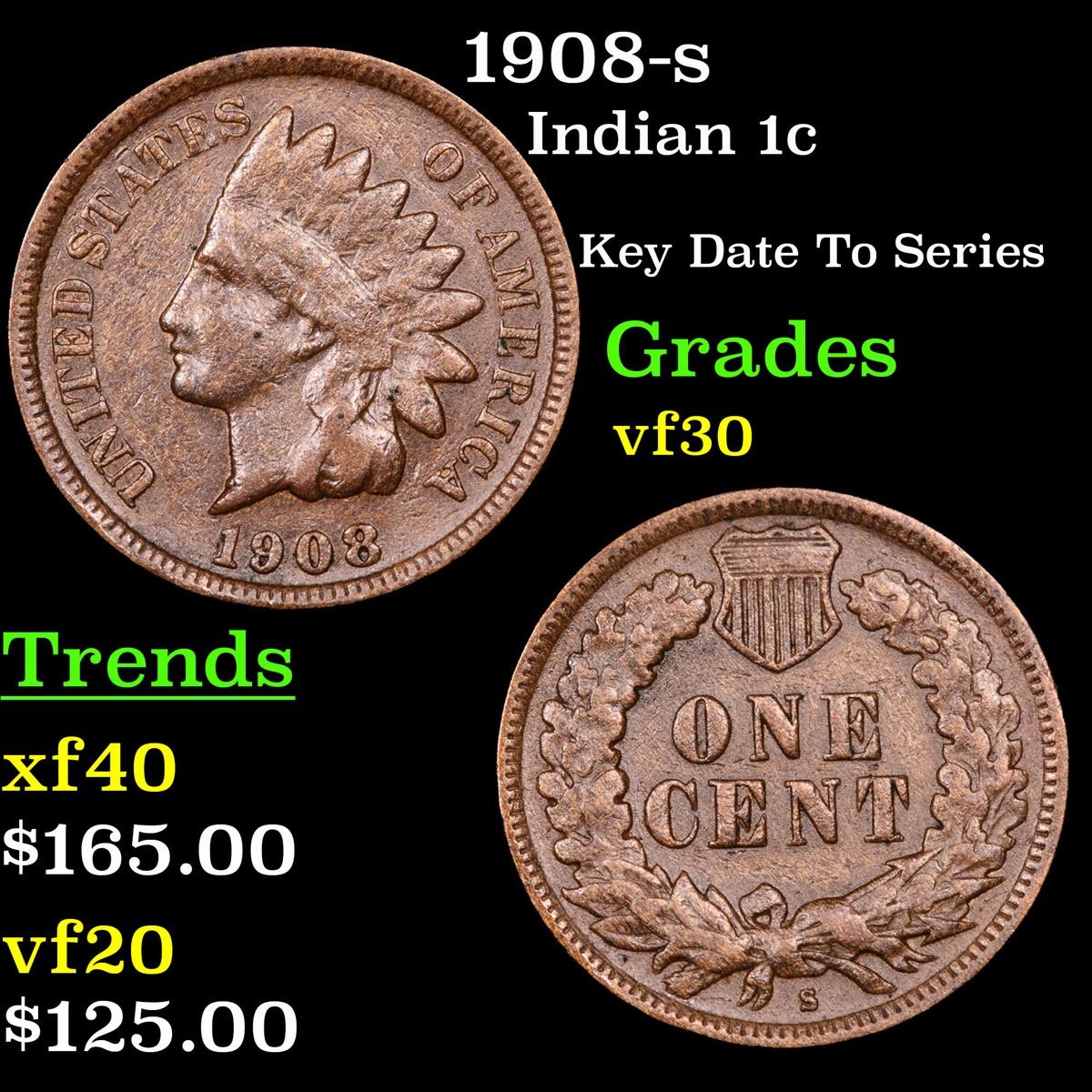 1908-s Key Date To Series . Indian Cent 1c Grades vf++. very scarce. Per PCGS :"The 1908-S Indian cent is the third lowest mintage circulation strike Indian cent. The only two other lower mintage coins in the series are the 1877 and the 1909-S, with the latter being the lowest mintage in the entire series." also PCGS estimates only 3000 survive in all grades
