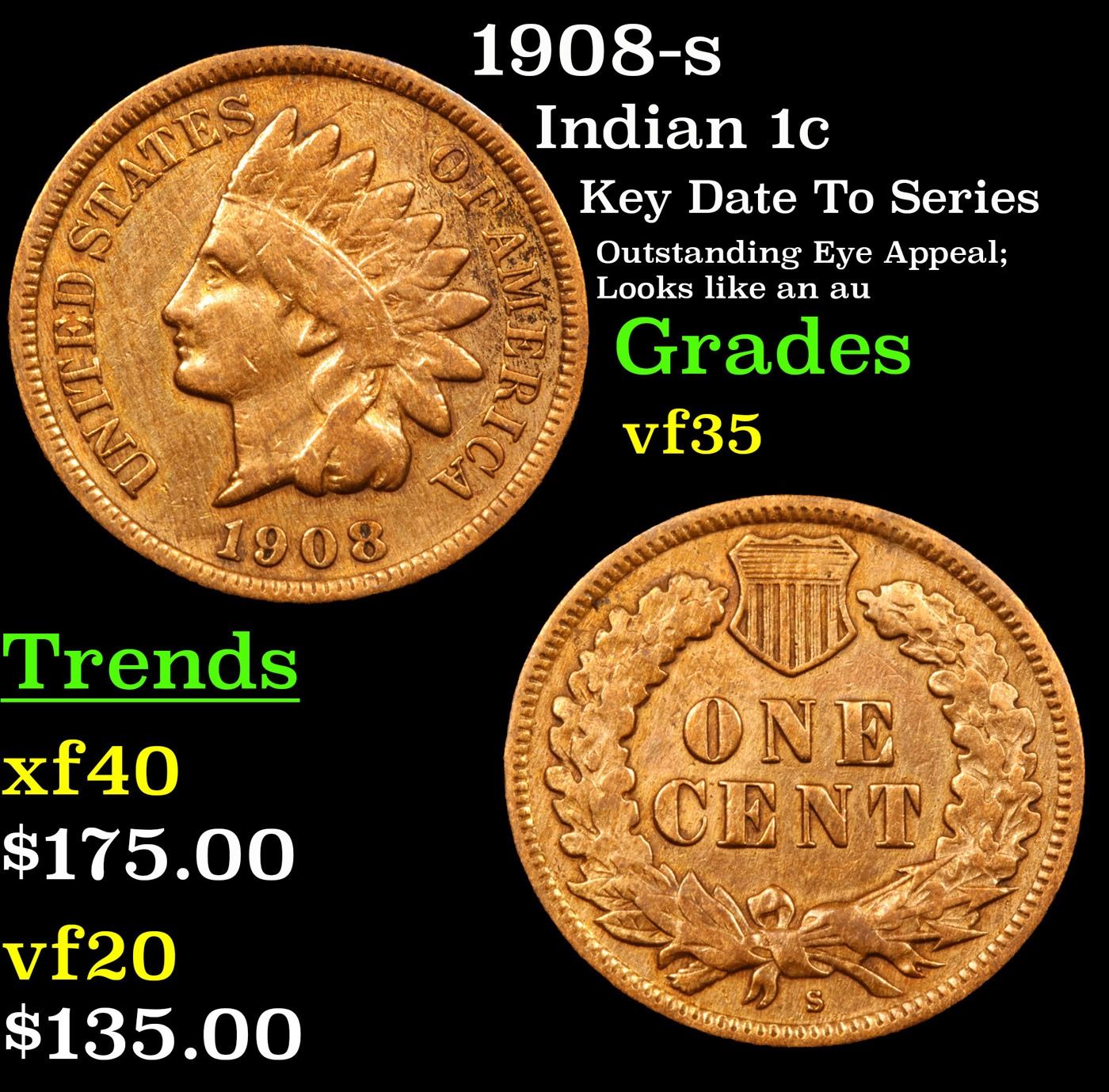 1908-s Indian Cent 1c Grades vf++. very scarce. Per PCGS :"The 1908-S Indian cent is the third lowest mintage circulation strike Indian cent. The only two other lower mintage coins in the series are the 1877 and the 1909-S, with the latter being the lowest mintage in the entire series." also PCGS estimates only 3000 survive in all grades