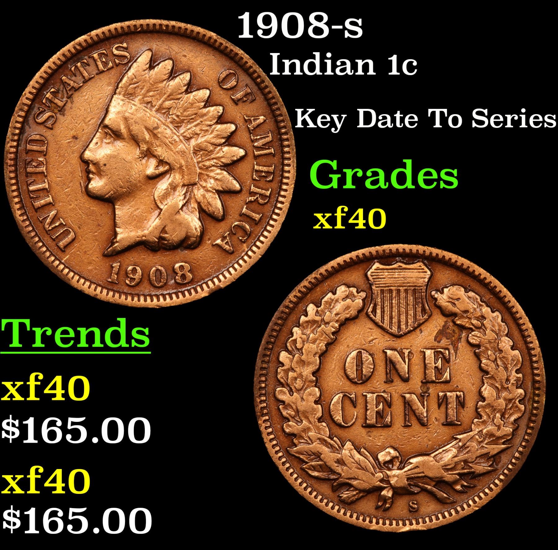 1908-s Indian Cent 1c Grades xf. very scarce. Per PCGS :"The 1908-S Indian cent is the third lowest mintage circulation strike Indian cent. The only two other lower mintage coins in the series are the 1877 and the 1909-S, with the latter being the lowest mintage in the entire series." also PCGS estimates only 3000 survive in all grades