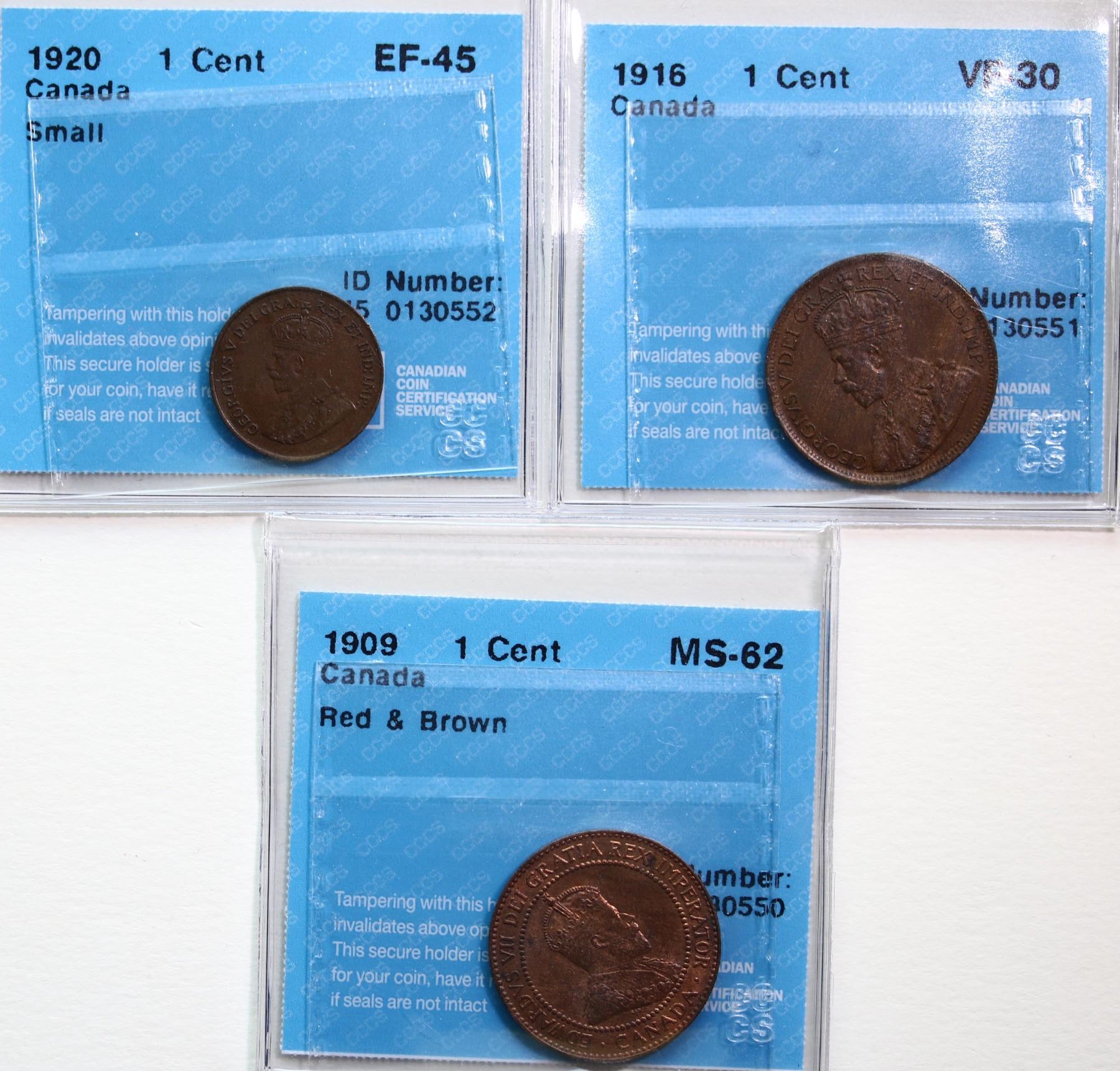 1909 1¢, 1920 "Small", 1916. Lot of 3 coins CCCS VF-30 to Choice Mint State-62.