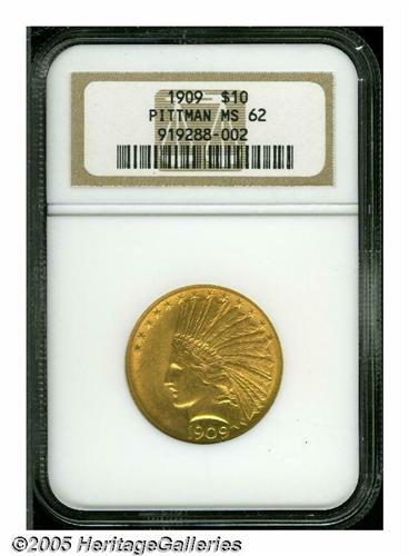 <B>1909<$10> MS62 NGC.</B></I> Ex: Pittman. A lustrous and smooth sunrise-gold type coin, boldly struck on the claws and olive branch unlike sometimes encountered.<BR><I>Ex: John Jay Pittman Collection, Part Two (Akers, 5/98), lot 2015.</B></I>
