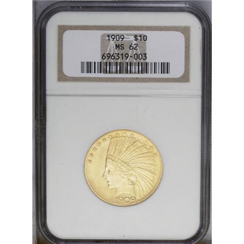 <B>1909<$10> MS62 NGC.</B></I> This lustrous canary-gold scarcer date Indian ten features unmarked fields and a few inconspicuous facial abrasions. <BR><BR><B>Important notice:</B> Heritage usually auctions material at the rate of 200-250 lots per hour. On some occasions eBay Live bid software or the Internet may not be able to keep up with the pace of the auction. We recommend placing a realistic absentee bid now as insurance to avoid disappointment. Occasionally the auctioneer may eliminate or reject an eBay Live bid, and the auctioneer may also reopen a lot after the close of the eBay live bidding (usually because we missed an audience bid), and may reject your bid even if it shows you as the winning bidder. By bidding via eBay Live, you agree that Heritage may award the lot to another bidder at its sole discretion under the circumstances described above or any other reasonable circumstances. Since eBay bids are not shown to us until we open the lot on the floor, we treat those bids just like floor bids. In most cases the floor responds before the eBay bid is presented to us, due to Internet lag time, so for consistency we have made it a policy that floor bids are always considered first over tie eBay live bids. Also please note that all Heritage lots purchased through eBay Live carry a 20% Buyer's Premium. Please make sure you read the Terms and Conditions before you bid. This lot is being auctioned in conjunction with a live floor auction by Heritage Galleries & Auctioneers. All final auction and invoice information will be supplied by Heritage Galleries & Auctioneers, and all other information should be considered preliminary. Lot:4113 <BR><BR><B>Winning Notification and Billing:</B> After the FINAL session in this auction is complete, Heritage will send e-mail and snail mail invoices. This process normally takes several days. All final auction and invoice information will be supplied by Heritage Galleries & Auctioneers, and all other information should be considered preliminary. <BR><BR>This auction will be conducted on a live auction floor and over the Internet through eBay Live. If you choose to place an absentee bid, please take a moment to <font color='#0000ff'><u><a href='http://pages.ebay.com/liveauctions/help/before/laabsentee.html'>learn how eBay Live absentee bidding works</a></u></font><font color='#000000'>