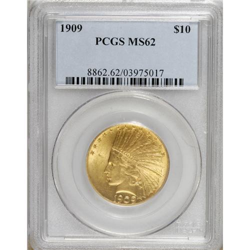 <B>1909 $10 MS62 PCGS.</B></I> This lustrous and boldly defined Indian ten is smooth for the MS62 level, and has substantial eye appeal. Among Philadelphia Motto issues, only the 1914 has a lower mintage.<BR><BR><b>Shipping:</b> Coins & Currency (<a target="_blank" href="http://www.heritageauctions.com/common/shipping.php">view shipping information</a>)