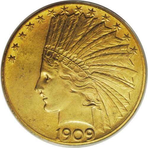 <B>1909 $10 MS63 PCGS.</B></I> The 1910 is a better date, confirmed by its low mintage of 184,789 pieces and its scarcity in Mint State. This luminous sun-gold piece displays vibrant luster, and the strike is meticulous, even on the often soft right half of the olive branch. The left obverse field has an unobtrusive group of thin marks.<BR><BR><b>Shipping:</b> Coins & Currency (<a target="_blank" href="http://www.heritageauctions.com/common/shipping.php">view shipping information</a>)