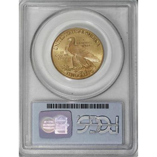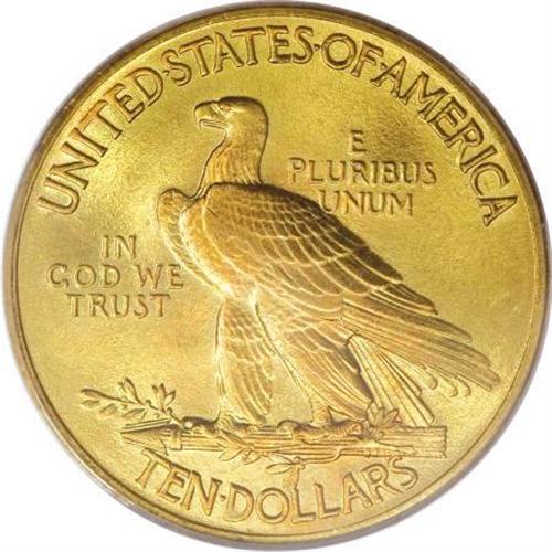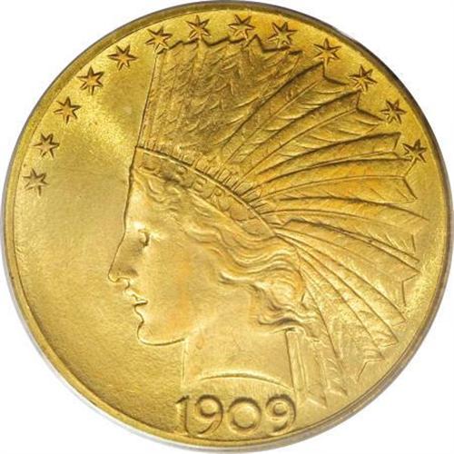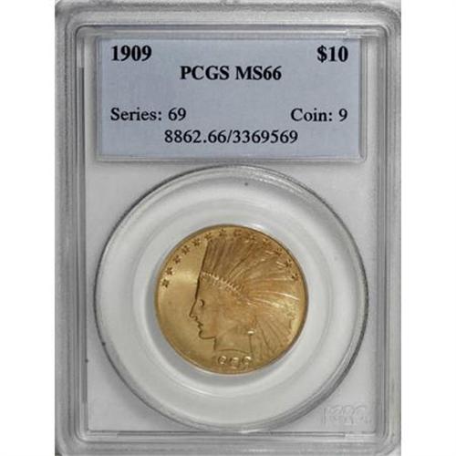 <B>1909 $10 MS66 PCGS.</B></I> Despite a nominal mintage that is about three times that of the well-known 1908-S rarity, the 1909 is comparably rare in Gem grade. In MS66, it actually edges out its mintmarked cohort. PCGS has certified nine 1909s in MS66, with only two coins finer, while it has graded 10 1908-S in MS66, with eight pieces in MS67 and two in MS68 (5/07)! A similar situation exists at NGC, which has graded five 1908-S in MS66 with six finer, yet it has certified only three examples of the 1909 in MS66, with three MS67s finer.<BR> It is more than likely that the two finer-graded PCGS examples of the 1909 (both MS67) are in strong hands, making this coin essentially among the handful of finest obtainable. And what a glorious coin it is, with radiant cartwheel luster beaming from the yellow-gold, mint-green, and orange-gold surfaces. The strike is crisp and bold throughout. Were it not for a single tick on the Indian's cheek, just behind the mouth, this coin might merit an even finer grade. As it stands, it is as desirable as it is rare.<BR><I>From The Belle Glade Collection, Part Two.</B></I><BR><BR><B>Coin Engraver:</B> Augustus Saint-Gaudens<BR><BR><b>Shipping:</b> Coins & Currency (<a target="_blank" href="http://www.heritageauctions.com/common/shipping.php">view shipping information</a>\)