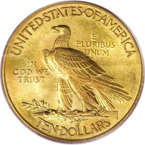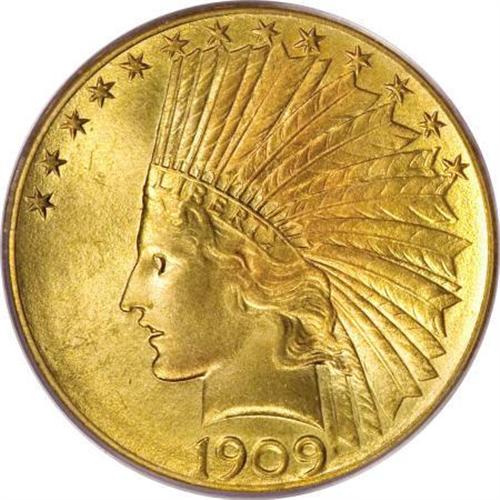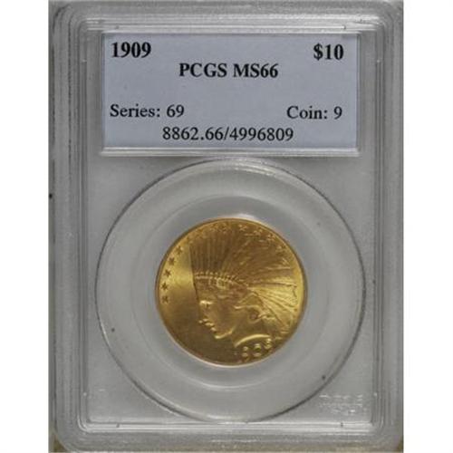 <B>1909 $10 MS66 PCGS.</B></I> The two new coin designs of 1907, by celebrated sculptor Augustus Saint-Gaudens, were quite different from one another. His design for the ten dollar gold coin, as shown here, features a bust of Liberty facing left and wearing an Indian warbonnet. His other design, for the double eagle, has a standing, striding full figure of Liberty. As noted by Breen, in his <I>Encyclopedia</B></I> (1988): "For the new eagle design, Augustus St. Gaudens (in consultation with Pres. Theodore Roosevelt) decided to use not a standing figure but a head, feeling that the heroic effect of any standing figure, as chosen for the double eagle, would be lost in smaller diameter."<BR> The business strike mintage of the 1909 Indian eagle was limited to only 184,789 pieces, the second-lowest total for a With Motto issue of this type from the Philadelphia Mint. This date is underrated in terms of rarity when compared to the better-known 1908-S, according to Jeff Garrett and Ron Guth (2006). <BR> Richly frosted, this coin shows pleasing radiance that accents the crisply struck design elements. The color alternates between lime-green and rose across both sides. Surface marks are minimal, as expected for a Premium Gem. It is difficult for us to imagine a much more attractive representative of the issue. Both major grading services combined have certified only 12 coins at MS66, with a mere five pieces finer at MS67, as of March 2008. <BR><BR><B>Coin Engraver:</B> Augustus Saint-Gaudens<BR><BR><b>Shipping:</b> Coins & Currency (<a target="_blank" href="http://www.heritageauctions.com/common/shipping.php">view shipping information</a>)