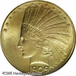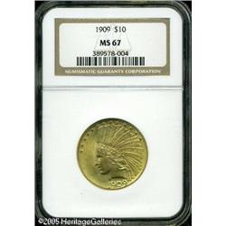 <B>1909 $10 MS67 NGC.</B></I> In his <I>Complete Encyclopedia,</B></I> Walter Breen said about this issue: "difficult to find in mint state." Just imagine what he would have said about this Superb Gem example! Indeed, this is an elusive issue in any and all grades. The mintage of 184,863 coins ranks 11th among the With Motto eagles, and even though mintage is not the whole story, this is an important consideration. Among the 1909 Indian eagles that we have handled over the years are two or three that graded MS66, but never before a Superb MS67. Just five examples are recorded on the combined population reports of both PCGS and NGC, however, we suspect that there may only be two or three coins involved, or possibly just this one.<BR> In 1988, David Akers wrote <I>A Handbook of 20th-Century United States Gold Coins</B></I> where he discussed this issue: "The 1909 is one of the rarest Philadelphia Mint issues, surpassed only by the 1933, 1907 Rolled Edge and the 1908 No Motto. Up to the grade of MS-62, specimens are not too difficult to locate and even in MS-63 they are encountered fairly often. True gems (MS-65 quality) are another matter altogether and they are very rare. Better than MS-65, this issue is almost nonexistent, although there are a few, and one is more likely to find a superb 1908 No Motto or 1908-S, for example, than a similar quality specimen of the 1909. (There are more gems of the 1909 around than there are gems of those two issues, however). This is one of the most underrated issues of the series."<BR> This Superb example, one of the finest extent, has rich honey-gold color with faint olive toning on the Indian's face and neck. The surfaces have a slightly grainy, satiny texture, not much at all different from the Proof issues of this date. The strike is exceptionally sharp. This is an excellent example of the date for the connoisseur, and may also be pursued by the collector who simply desires to own great coins. Population: 3 in 67, 0 finer (1/05). Lot:8857
