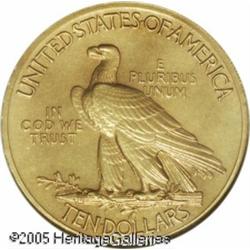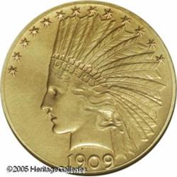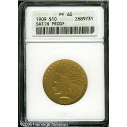 <B>1909 $10 PR60 ANACS.</B></I> Like any proof Ten Dollar Indian, the 1909 is both rare and desirable. A mere 74 specimens were struck in this second year of production, several among which have presumably been lost or spent. The matte surface for the 1909 and 1910 proofs is the briefly used Roman Gold finish. This semi-brilliant proofing process gives the piece a bright, satiny appearance with a soft orange-gold color (faint lilac hues are also present on this example), clearly different from the traditional matte finish. Roman Gold Tens are very rarely seen today and infrequently appear at major auctions. Seemingly conservatively graded, no hairlines or abrasions are readily evident, and the surfaces have an original appearance. Lot:8908