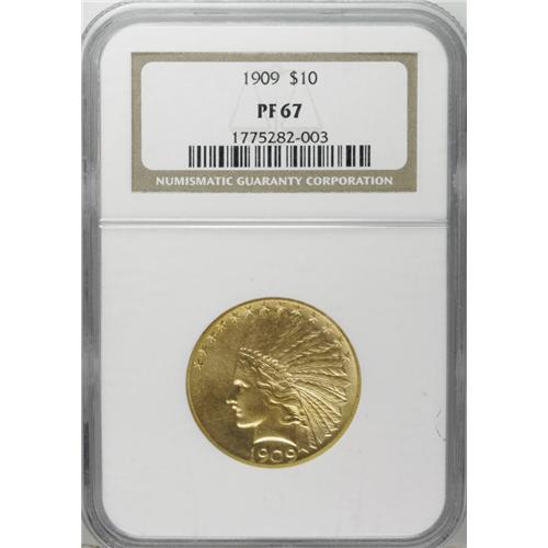 <B>1909 $10 PR67 NGC.</B></I> This is an exceptionally rare proof gold coin, with only 74 specimens struck in this year of issue. It has been variously reported that between 7-9 and 20 proofs still exist. Akers uncovered only 13 appearances in auction over the decades he surveyed for his work on the series. We believe the number of pieces extant to be somewhat higher and estimate that perhaps 30-45 pieces may still exist. The proof process for this year and the next is the enchanting Roman Gold finish. This gives the coins a bright, satiny appearance with light color, obviously quite different from the traditional, darker matte finish. (Breen noted in his <I>Encyclopedia of U.S. and Colonial Proof Coins</B></I> that two 1909 coins are known that exhibit the matte finish that was also used on most 1908 proof eagles.) Roman Gold Indian eagles are very rarely seen today, and infrequently appear at major auctions.<BR> The surfaces of this piece are bright and satiny and, as the grade would indicate, there are no mentionable marks or flaws that might be mentioned as identifiers for future research. The reddish-golden coloration is enchanting, and is one of the most noteworthy attributes of this particular piece. A rare opportunity for the gold specialist to purchase a Superb Gem example of one of the most elusive proof Indian eagle issues at this lofty grade level. Census: 4 in 67, 1 finer (11/06).<BR><BR><b>Shipping:</b> Coin/Currency (<a target="_blank" href="http://www.heritageauctions.com/common/shipping.php">view shipping information</a>)